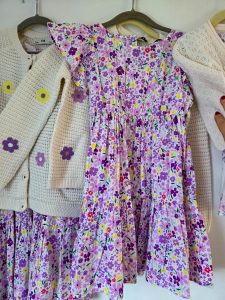 I did not have much of a color concept for this years Easter outfits but immediately knew that those purple flower dresses would be amazing. How adorable is the caridgan with the yellow and purple knitted flowers !!!