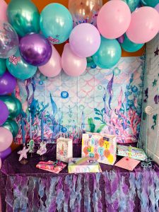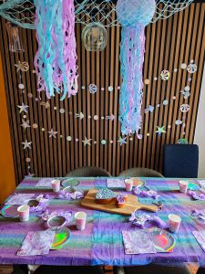On Friday it was my big girl´s kids birthday party. I had 6 girls over as guests plus my 3. Quite a lot going on but they all behaved really well and had fun coloring and looking for little treasures in the sand box. As you can see the theme has been mermaid and I loved everything about the decor. So fun putting this up.