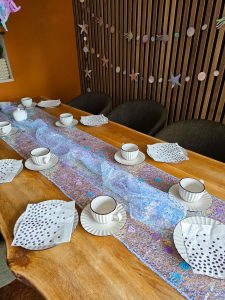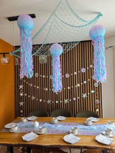 The fishing net with the jellyfish are probably the coolest table decor we ever had. And since we are having those accoustic panels on the back of the dining area it is super easy to decorate here as well. Garlands of jellyfish, shells and seastars.