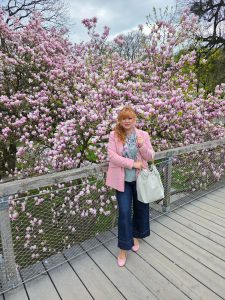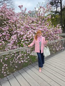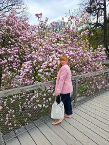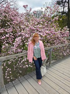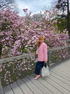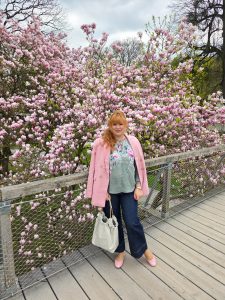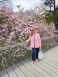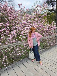 Matching the tree hasn´t been a coincident on my side cause we visited last year around the same time and I packed a few matching pieces just in case the trees would be blooming. The location of is inside the gardens of castle Mirabell. If you go there early (we went there around 8:30) there is no one there. Plus points are that there is a bridge in front of the tree so you are in the middle of all the pink blossoms.