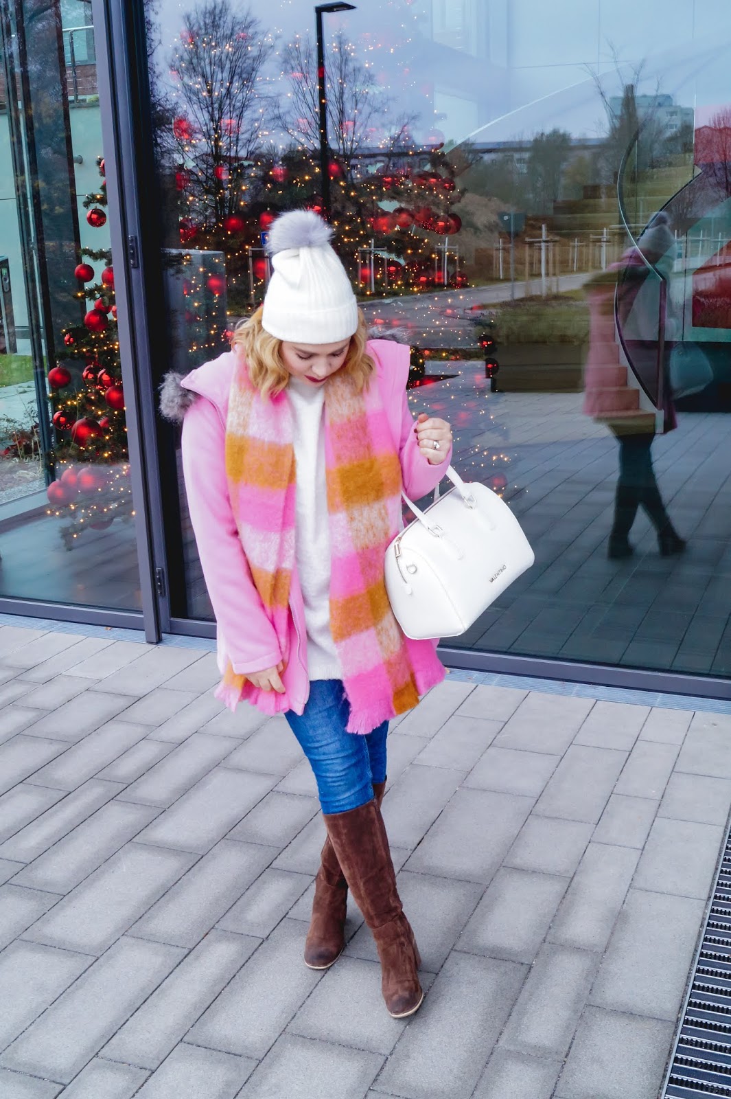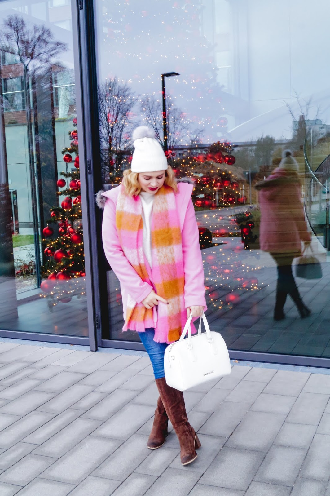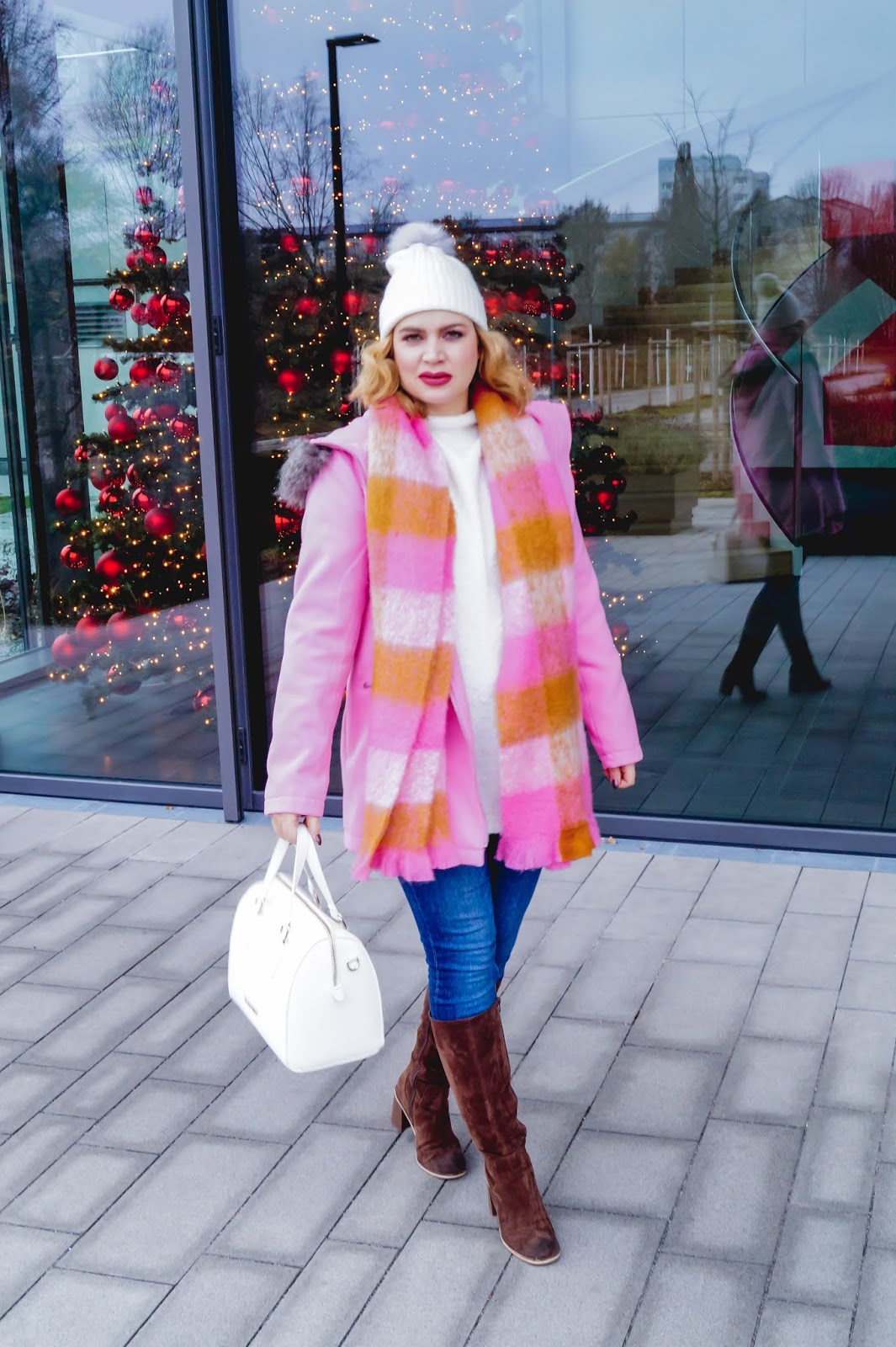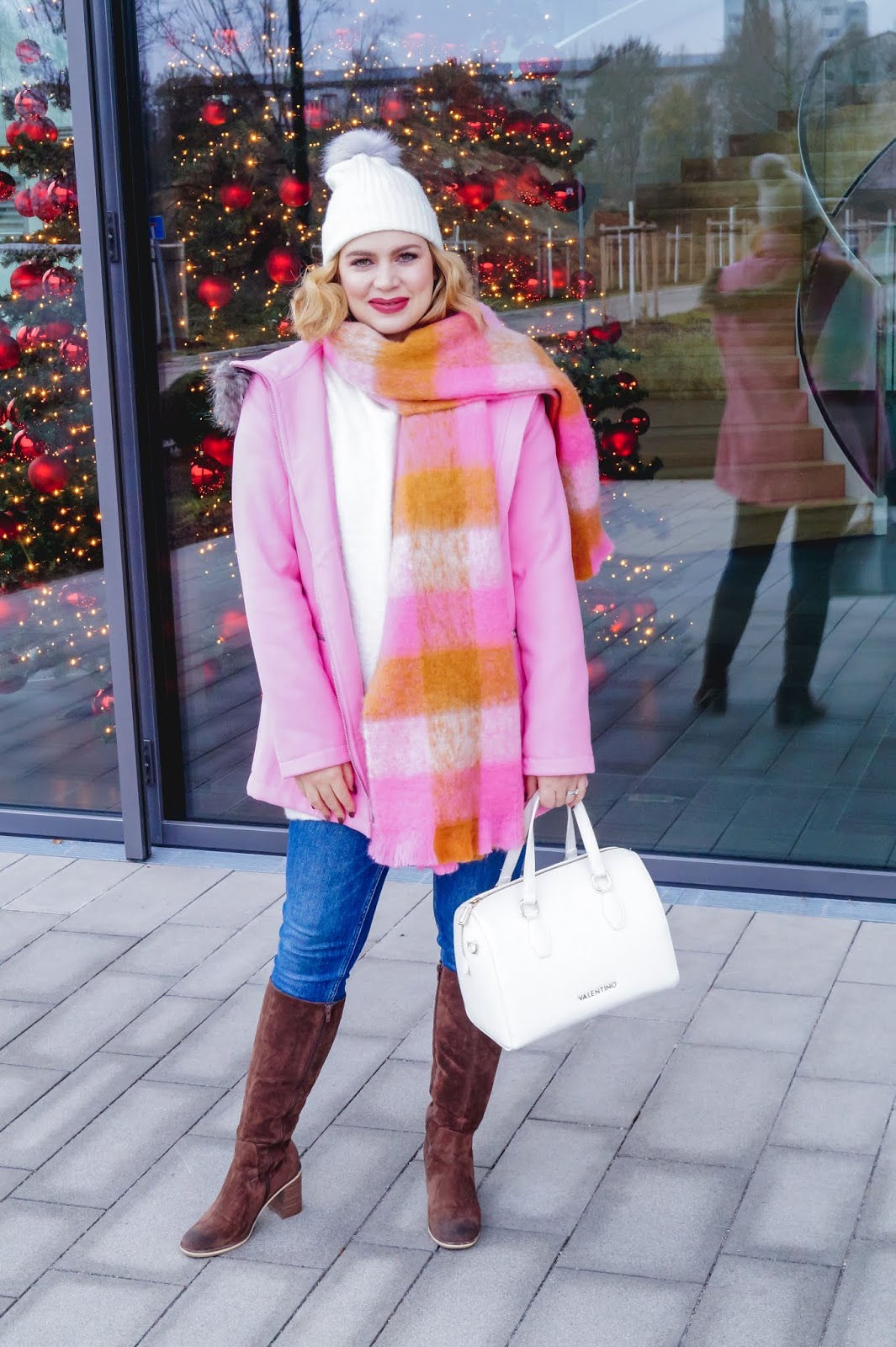 Staying cozy in the Winter is one of my favorite things and I am also prooving that Winter mustn´t be sad and black at all. What about a pink jacket including a matching fuzzy blanket scarf. And plaid is super fashionable anyways so it doesn´t matter what color combination you choose to be your favorite. For the rest of my look I kept it pretty simple with a pair of high-waisted jeans and a white sweater I got last year. I decided to go with brown boots after all as the contrast isn´t as harsh as with black (if you are super trendy and have a pair of white boots feel free to wear these).
