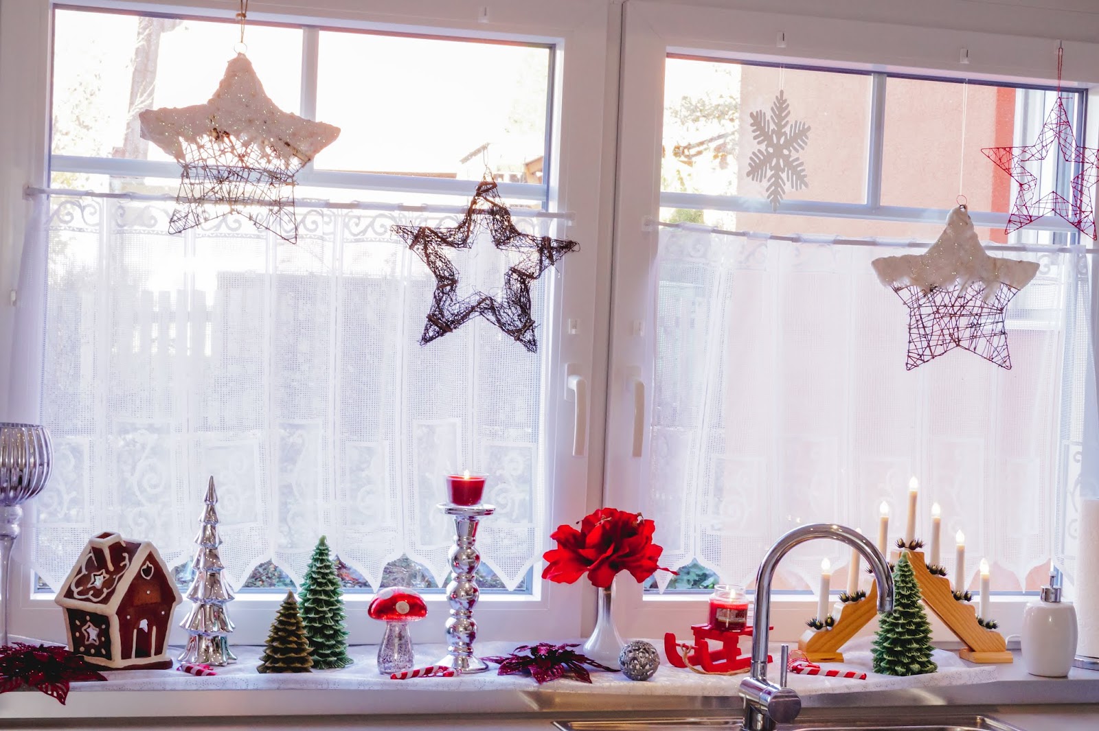 I haven´t had this much decor in our kitchen the years before. I always decorated the windowsill with lots of Christmas decor and candles but that was pretty it. This year I added christmassy kitchen towels and a bunch of poinsettias to my kitchen. I also reused the branches with berries and the red ribbons from two years ago for our bar stools. Absolutely love how our kitchen turned out and since most of our kitchen appliances are red I went with the classic Christmas Red pieces all over.