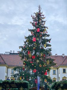 A very very small but cute Christmas market across the bridge of the city centre. It only has a few bothes but usually totally different things than the other markets offer. The view over to the big cathedral the dome and the river danube is breathtaking.