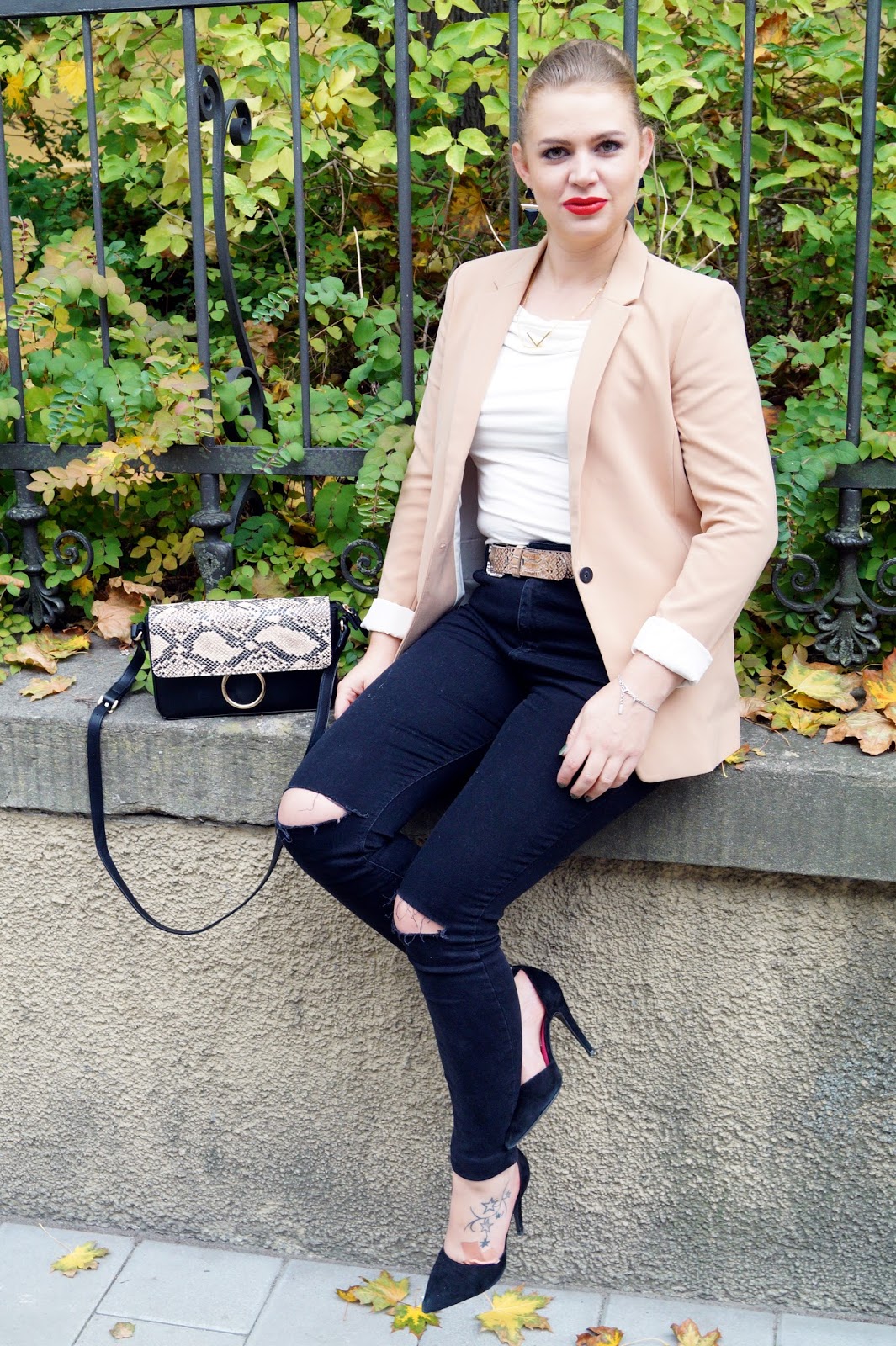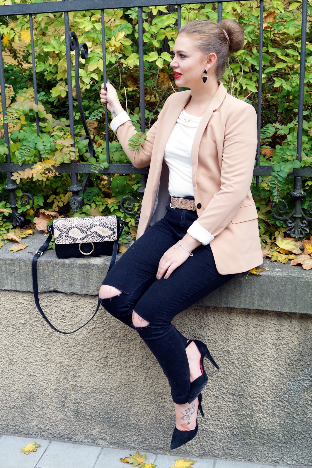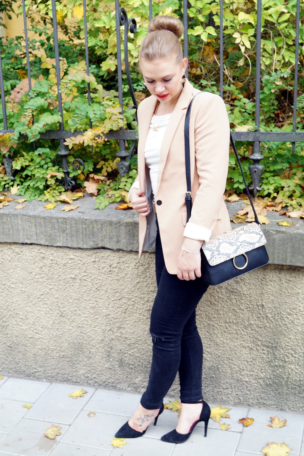 This color combo really works for any ocassion and always looks sleek and put together. For this look I paired my skinny distressed jeans from even & odd with a boyfriend blazer I got from the H&M online store. I really love the loose fit on blazer. Makes them a little cooler and edgier and less business.