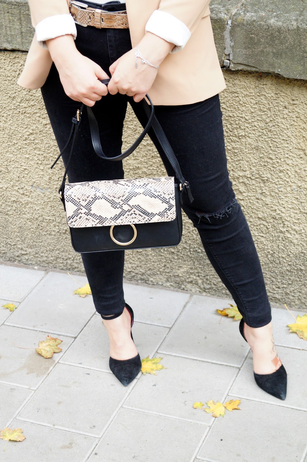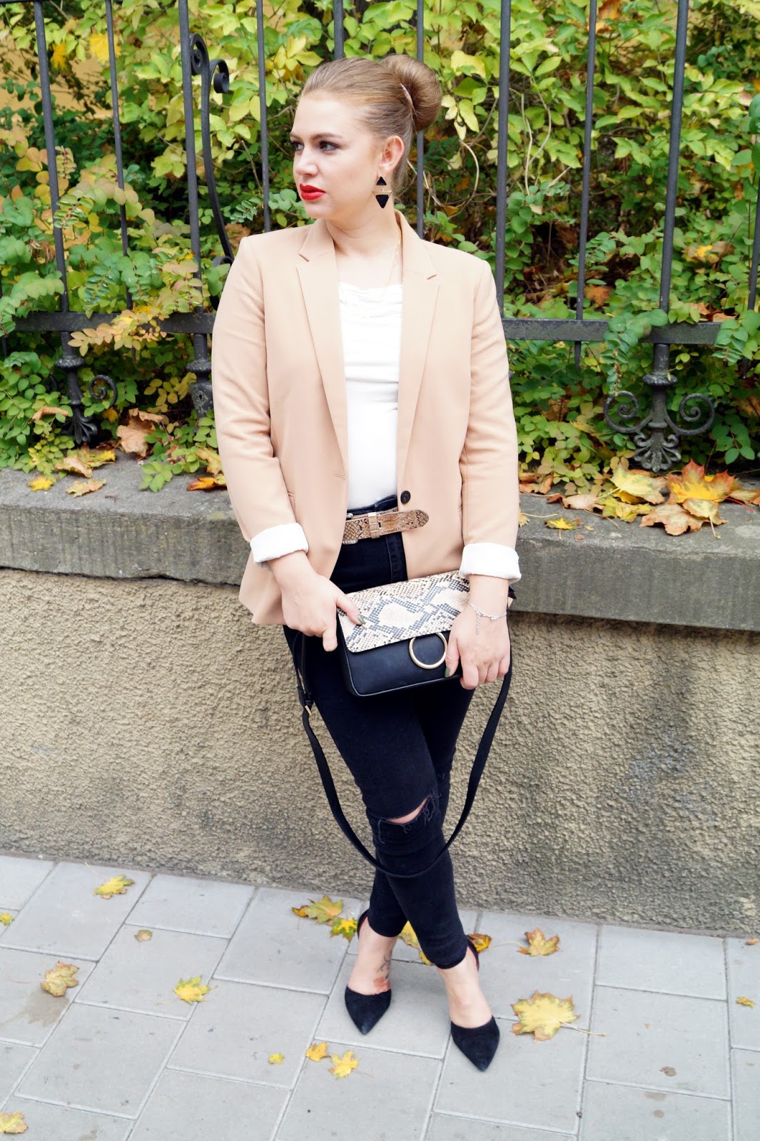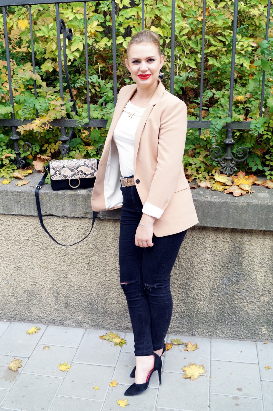 This color combo really works for any ocassion and always looks sleek and put together. For this look I paired my skinny distressed jeans from even & odd with a boyfriend blazer I got from the H&M online store. I really love the loose fit on blazer. Makes them a little cooler and edgier and less business.