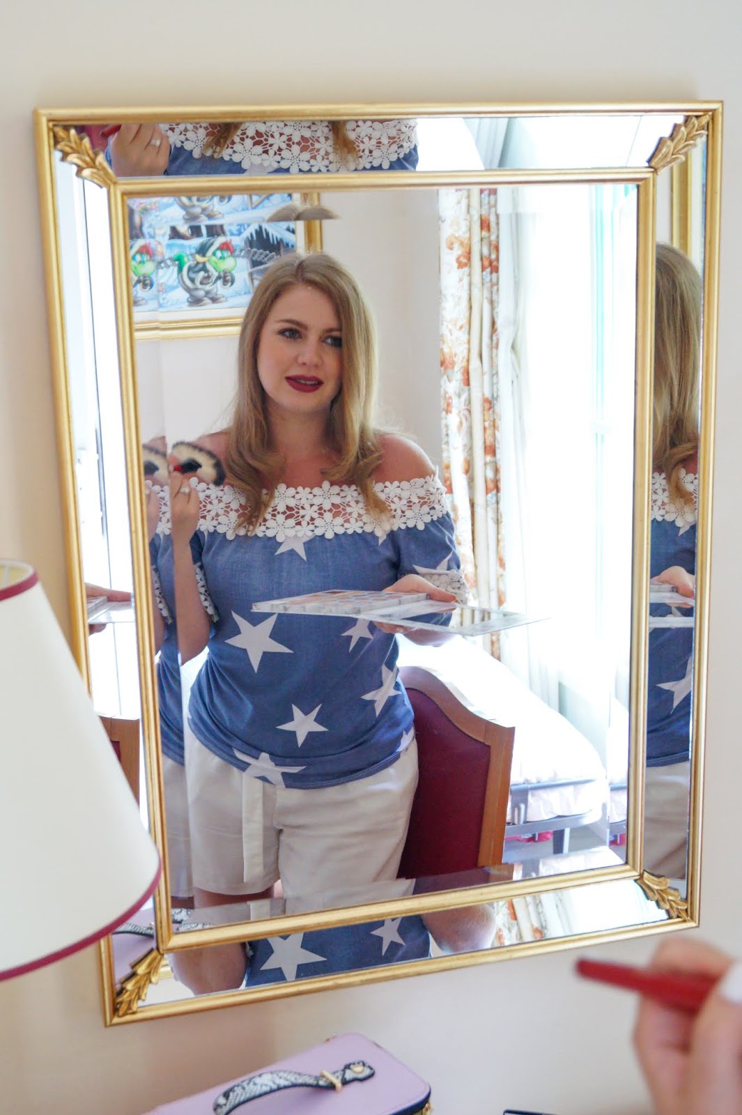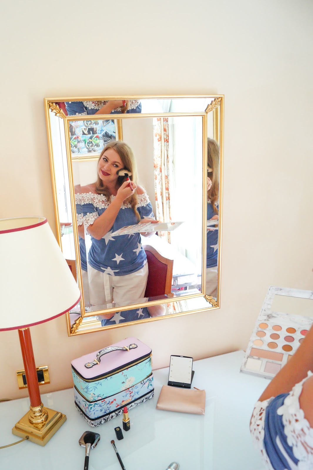 shorts H&M similar here and here / off-shoulder shirt unknown similar here, here and here / vanity case River Island other style here, similar case here and here