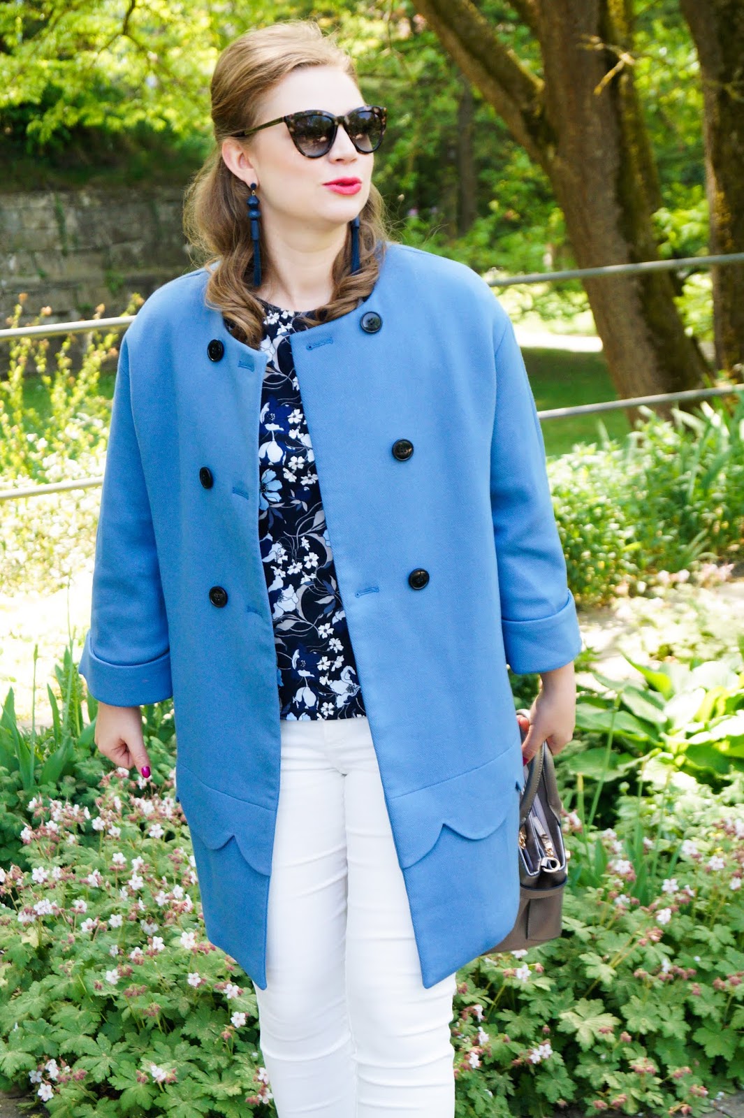 shirt H&M / denim H&M / wedges old similar here / bag Carpisa similar here and here / sunnies H&M / tassel earrings H&M / scalloped coat even & odd similar here and here and here