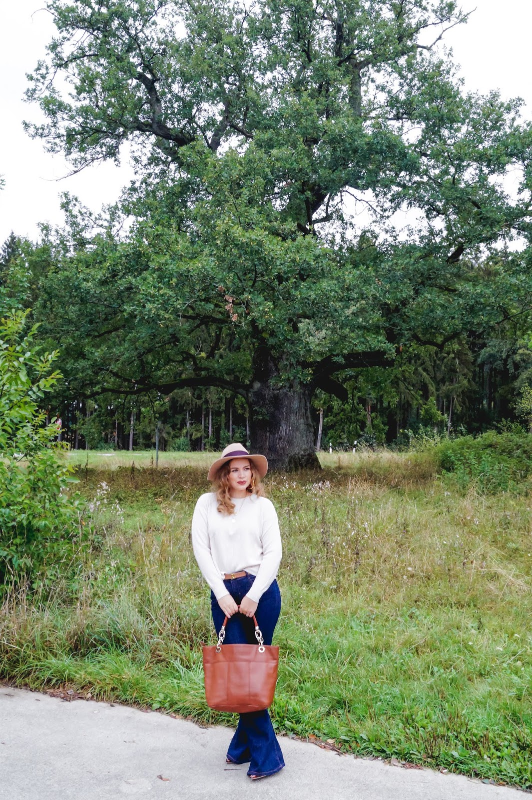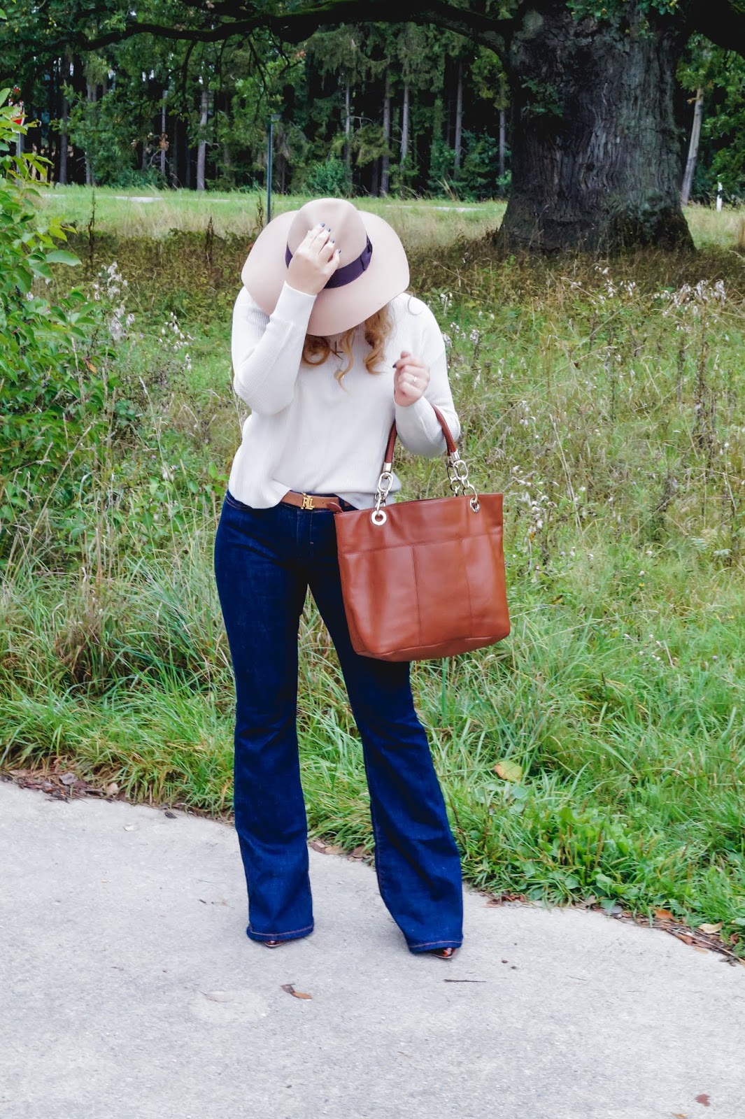bootcut jeans Mango / knotted back sweater Mango / bag Tommy Hilfiger old similar here and here / belt Lauren by Ralph Lauren similar here / wool hat H&M old similar here and here / disc necklace H&M / K necklace Necklesse