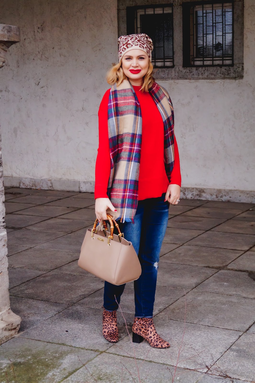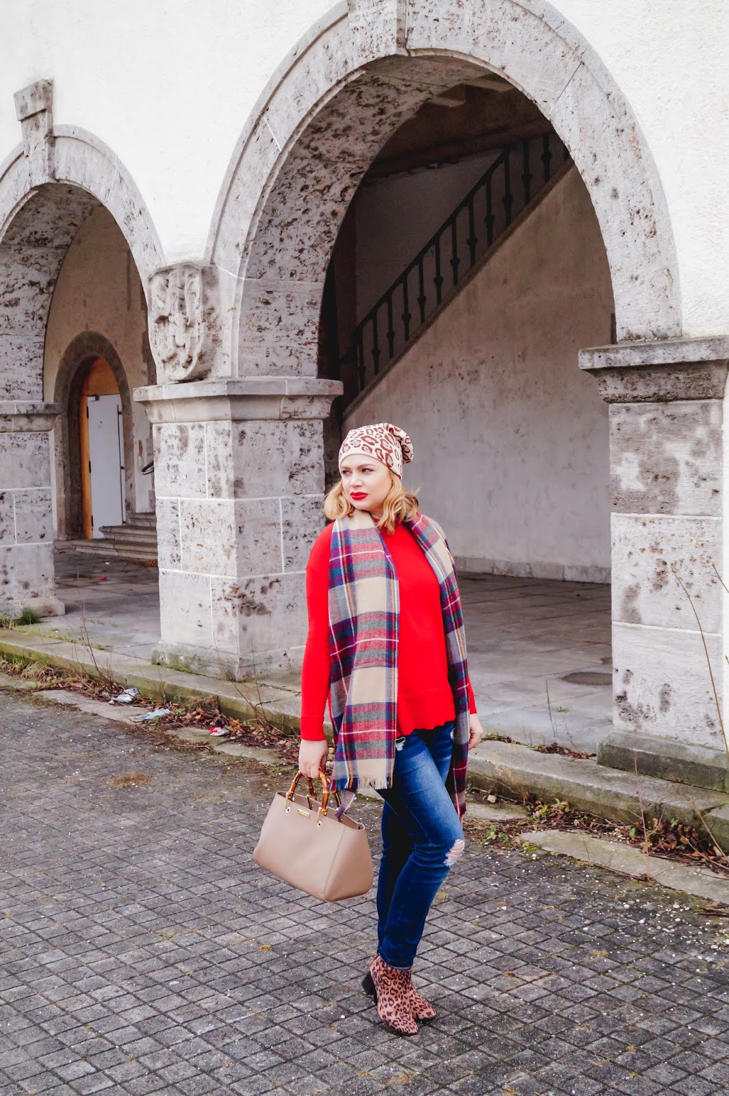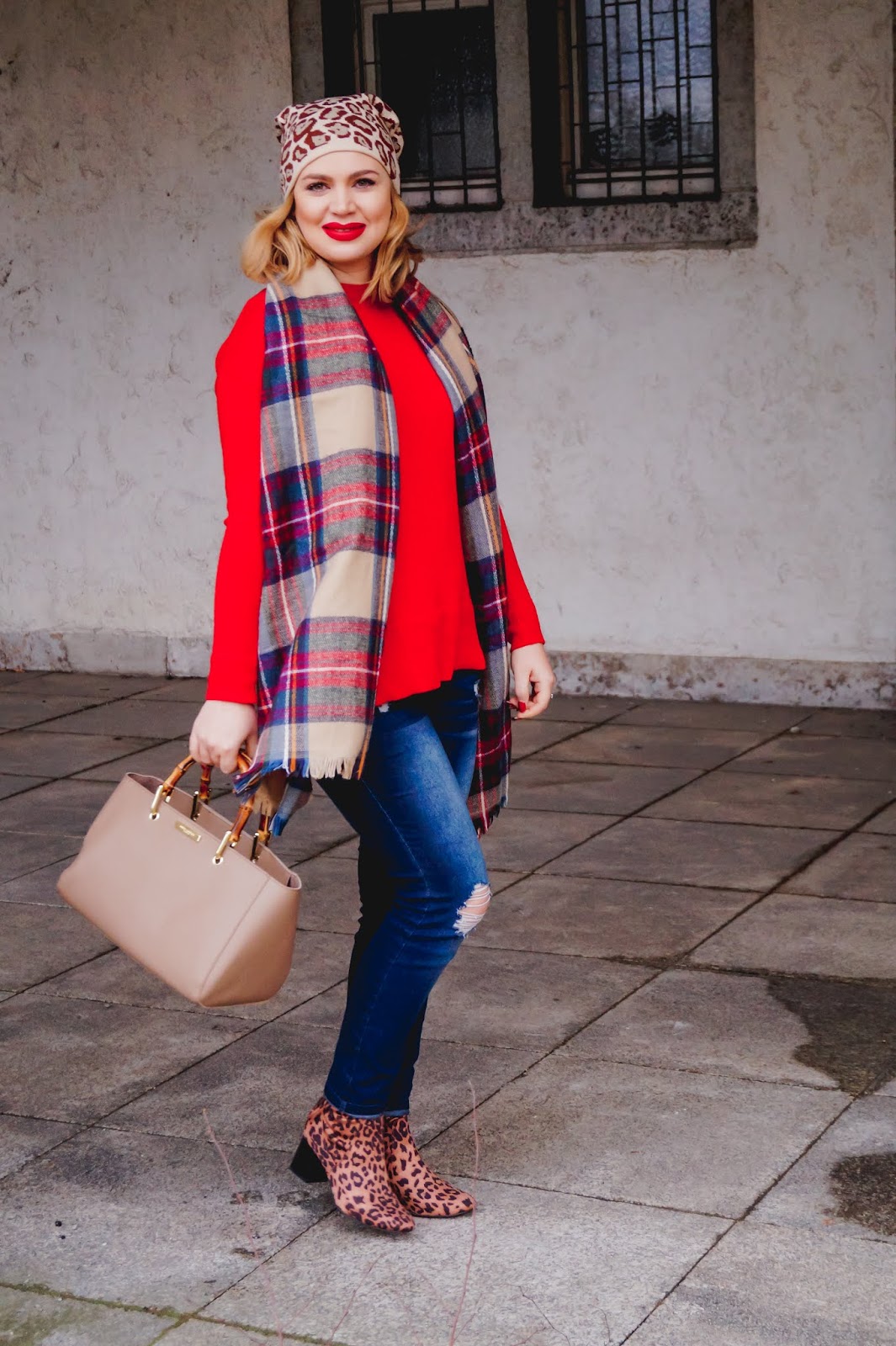 red pullover H&M old similar here and here / leopard print booties New Look sold out similar here and here / plaid scarf old similar here and here / Katie Loxton hand bag similar here and here / leopard print beanie similar here and here / lips MAC Red