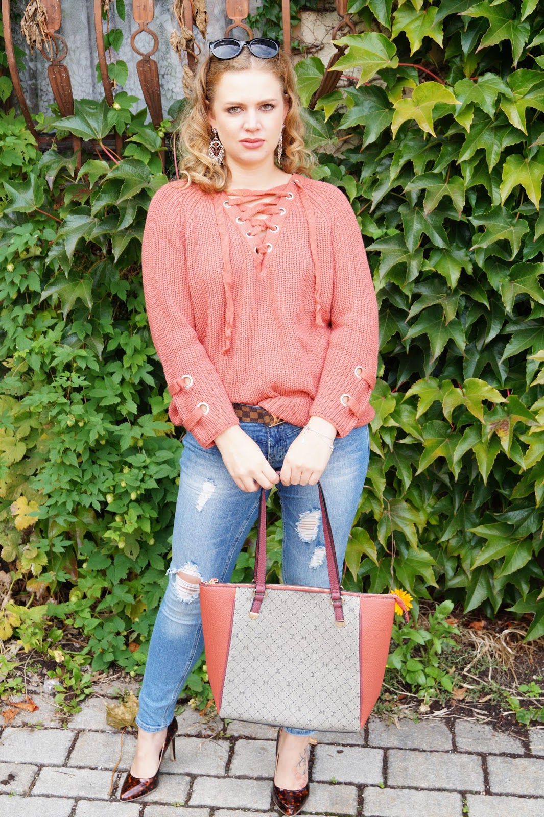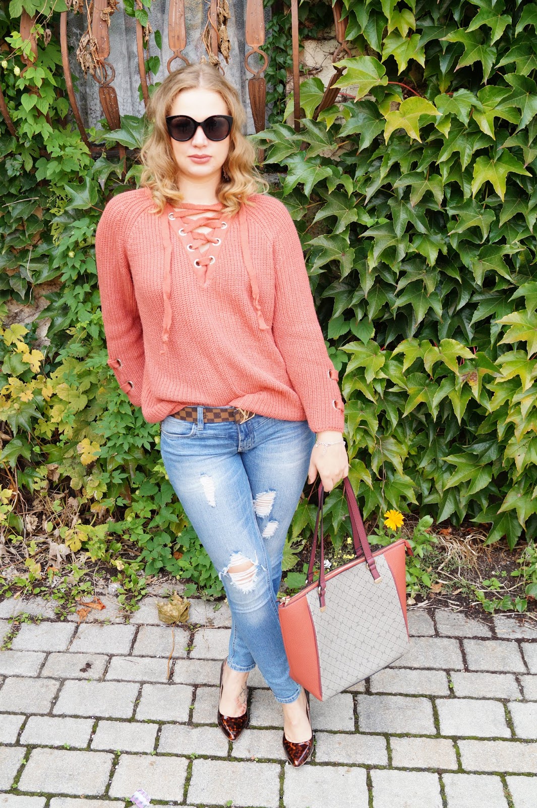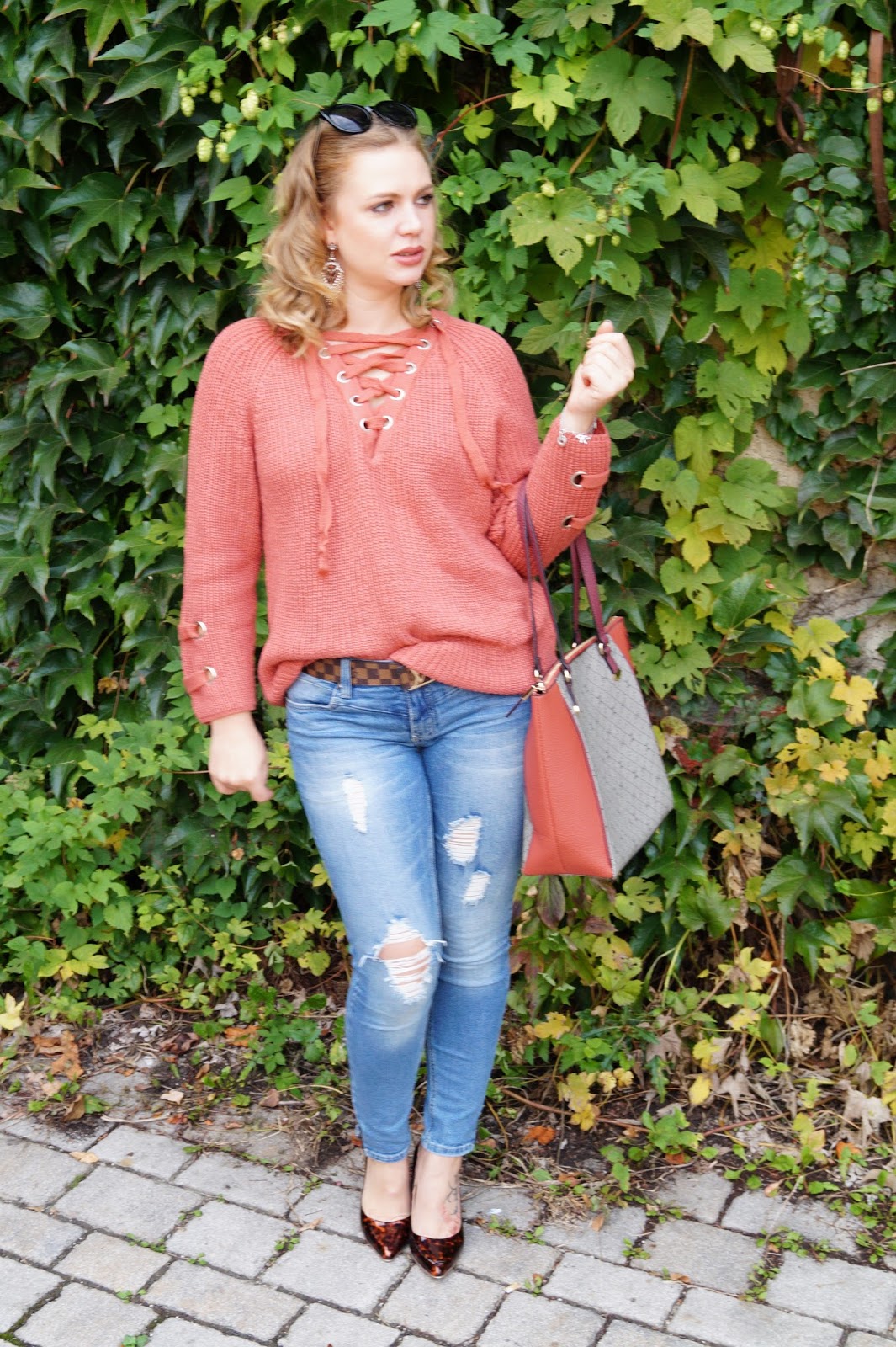 I paired it with a pair of distressed jeans, a pair of pointed high heels with a tortoiseshell optic in brown and my „fall bag“ from Carpisa. I love the color pairing of orange and burgundy and the dark nude shade so I call it my fall bag. I put one side of the pullover into my pants so it wasn´t totally usesless wearing a belt and also because it became a real fashion thing to tuck your shirts into your pants even it is only on one side or just in the middle.