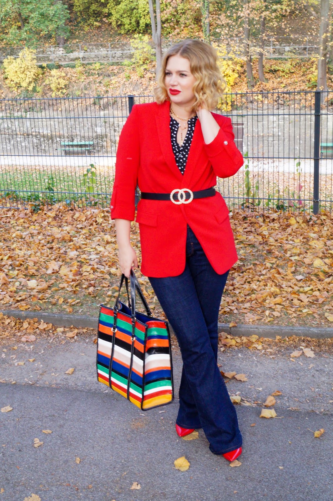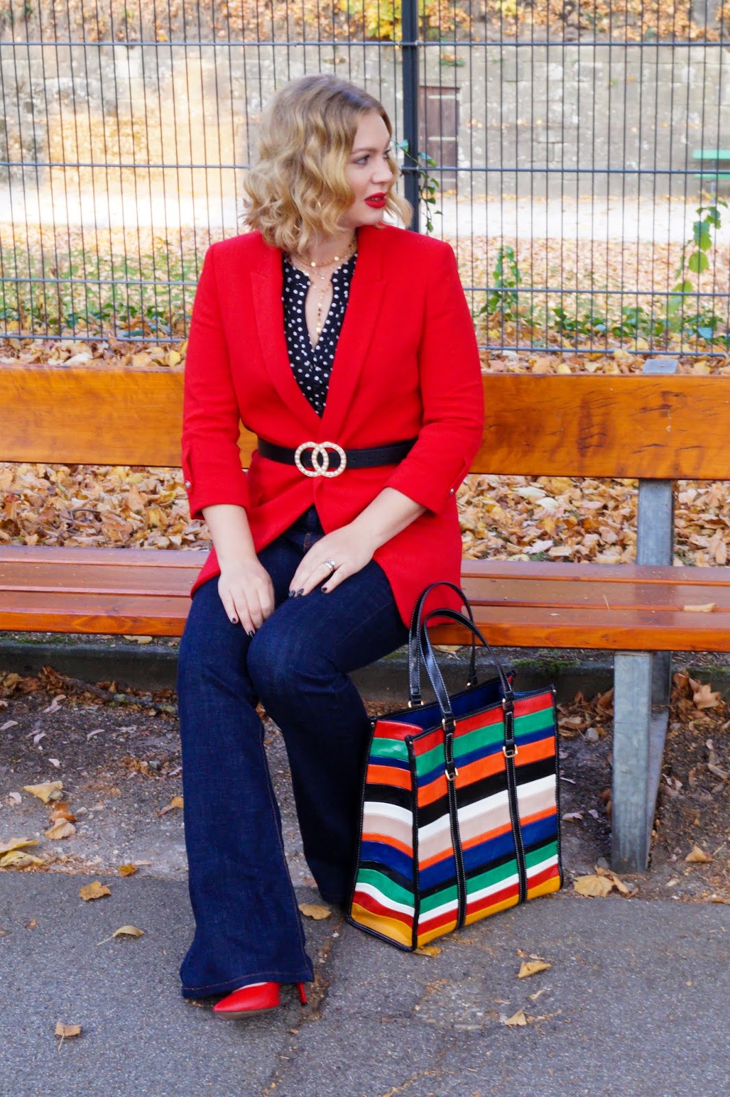I paired the blazer I got a few weeks ago with a polka dot shirt. Since I have seen this so many times I wanted to belt my blazer jacket too but wasn´t sure it it would be possible since there are no buttons on this jacket but it worked just great. The embellished double ring belt was the best of dupe finds from last year and I still loving wearing this piece all the time. For some more pops of color I added this stripped shopper bag I got from Mango and a pair of red leather pumps which peek out of my flared pair of jeans.