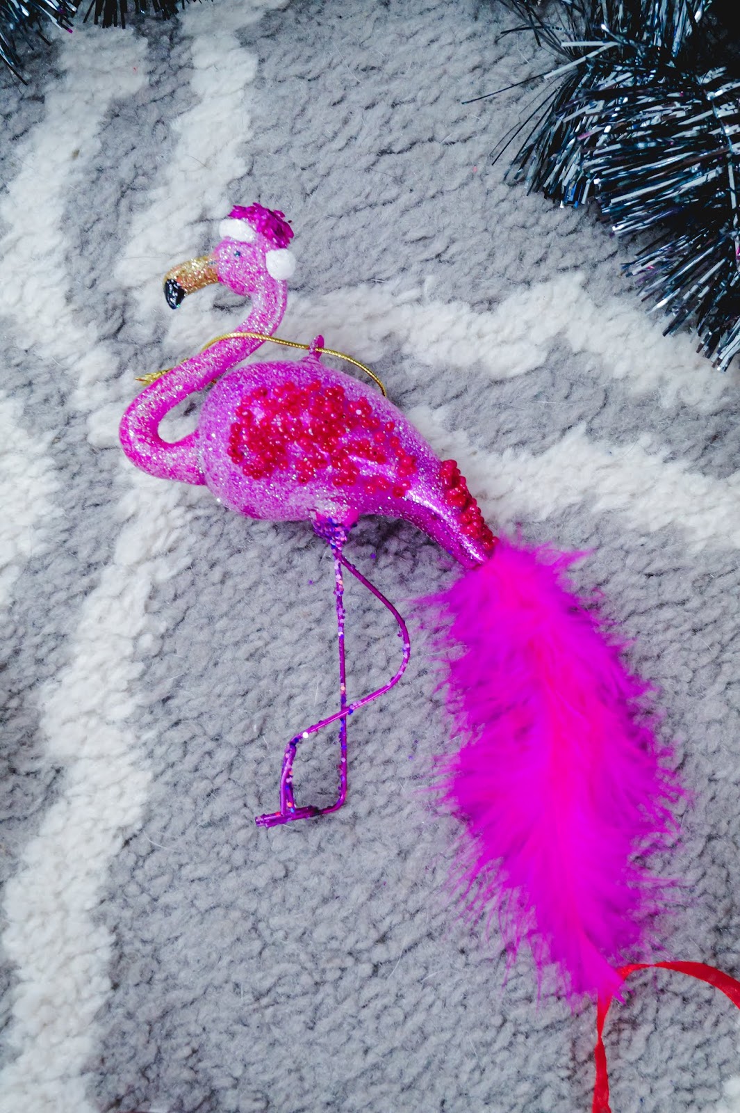 I decided to to with a black garland rather than a pink one because first of all I could´t find the matching shade and second of all I didn´t wanted to create a pink overload so I went with this dark grey/black metallic shimmery garland. I cut it into short pieces to drape it around several branches. In my opinion I think it turned out very nice and is another way to decorate your tree.