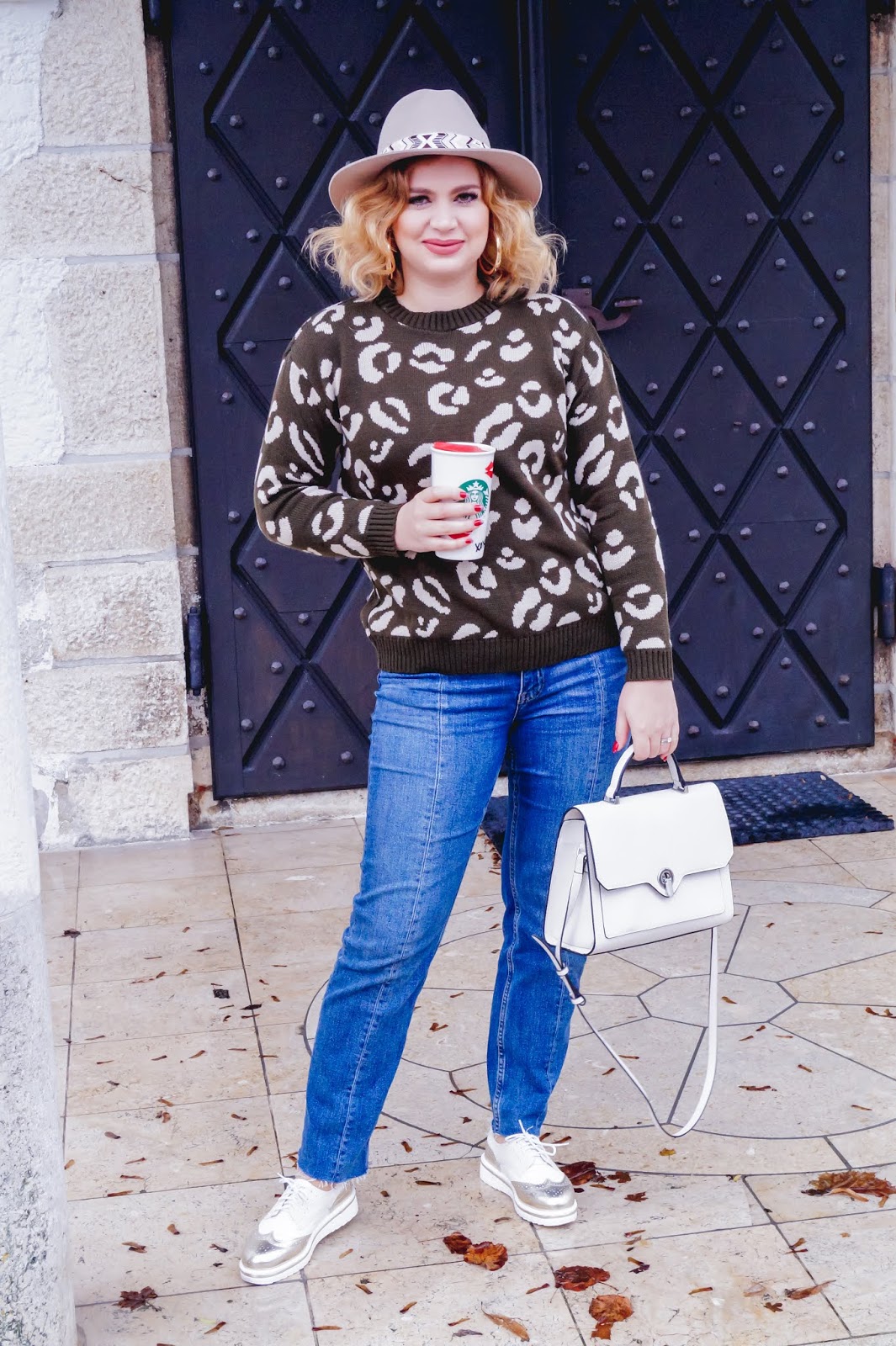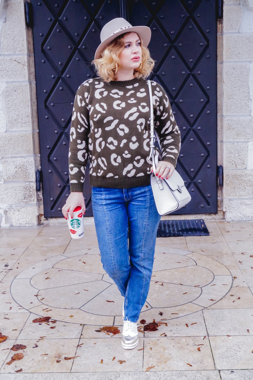 leopard knit sweater Asos sold out similar here and here / denim H&M old similar here and here / handbag Mango sold out similar here and here / hat H&M Divided sold out similar here and here / platform sneaker old similar here and here/ lips Velvet Teddy by MAC / gold hoops H&M sold out similar size here and here