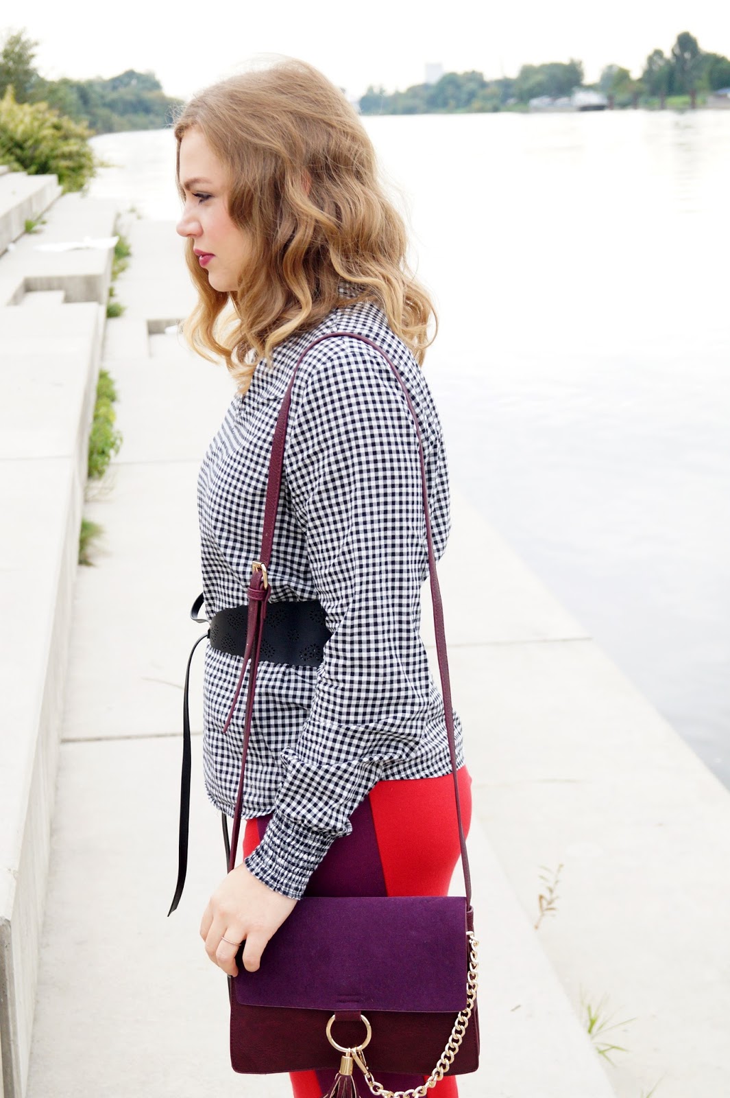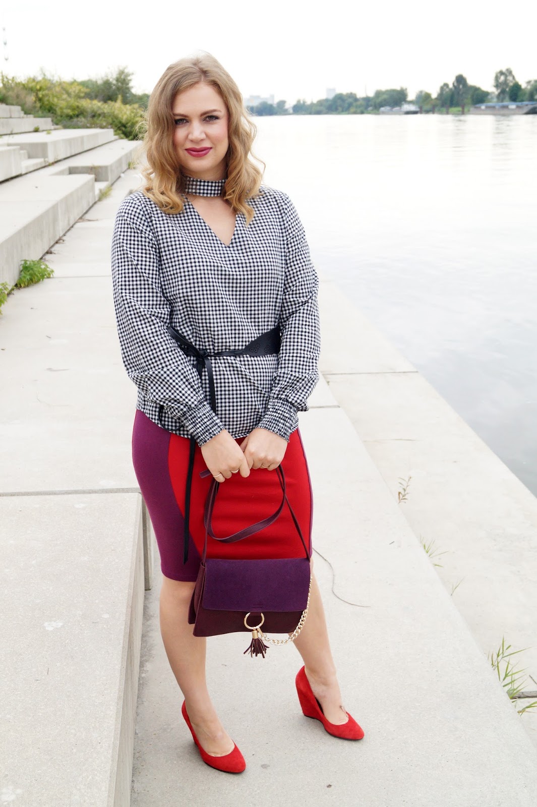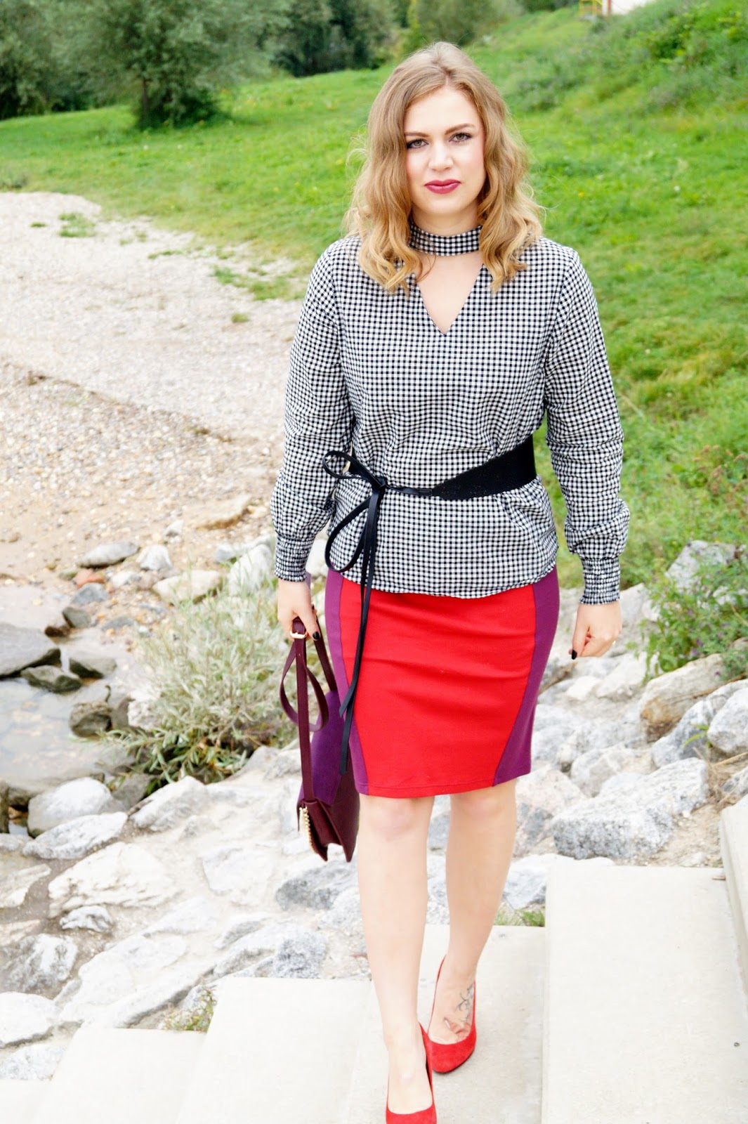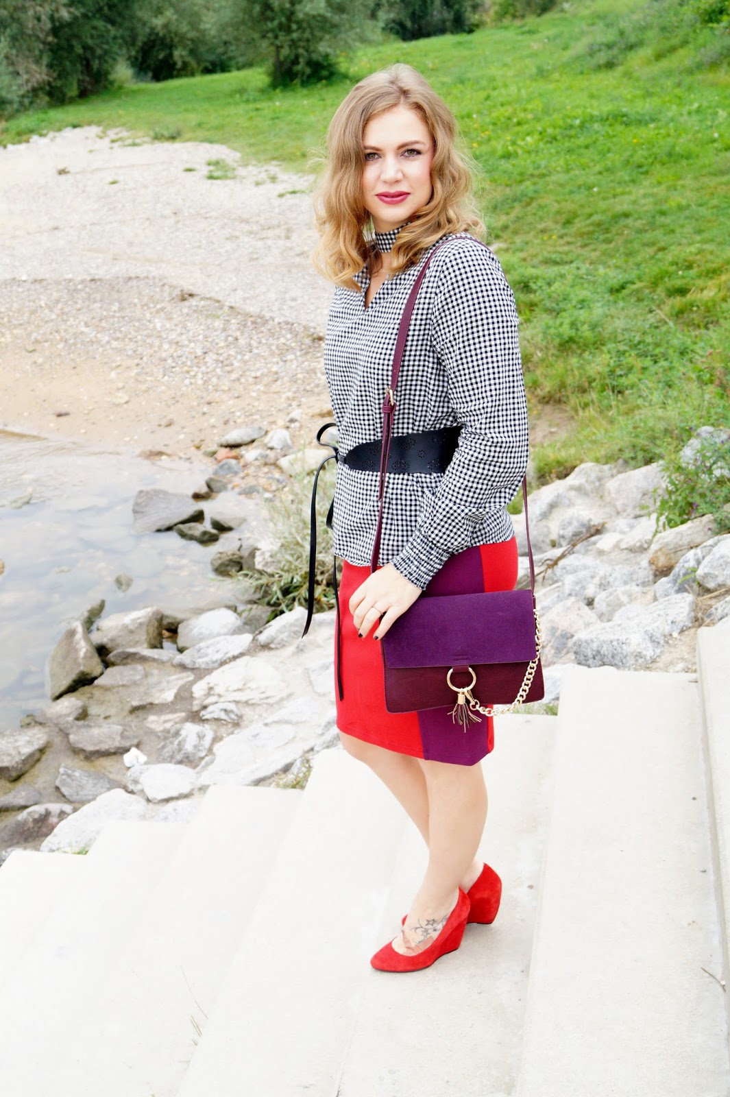 I paired it with a color blocked skirt in red and purple shade. This skirt is really old but I have to admit that I have never worn it. I just didn´t know what to combine to it – yes this also happens to fashion blogger – until some day. Maybe you know that feeling. You buy something you really like but there isn´t anything to combine to it so you keep the piece and wait and some day the right other half comes along and you have a matching outfit. Or maybe I am just a little strange sometimes.