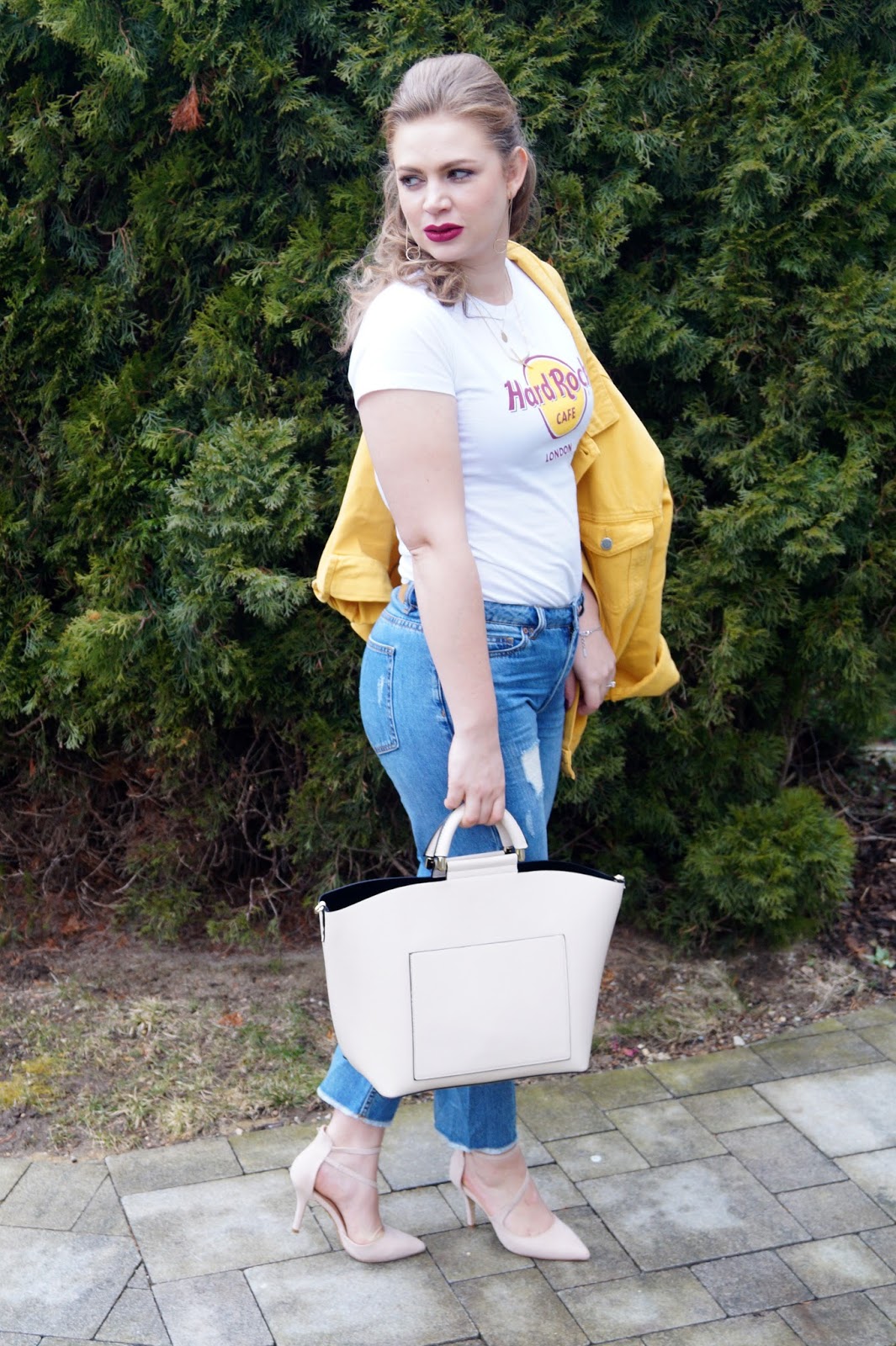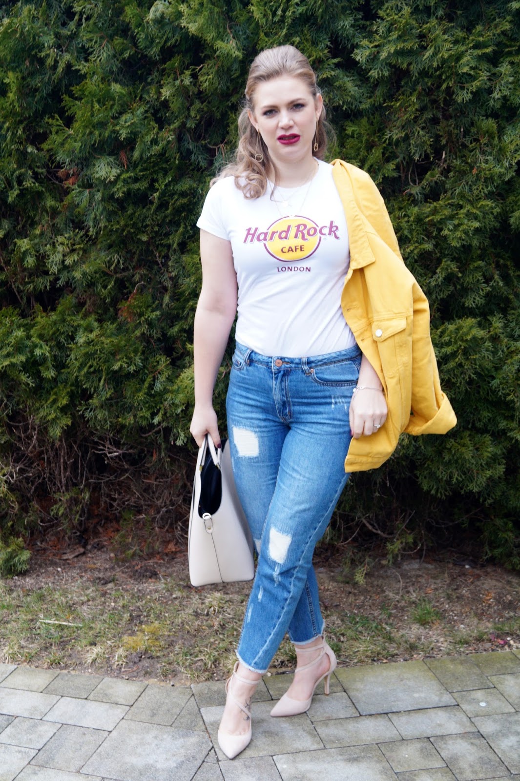 The Hard Rock Café t-shirt is from our London trip one year ago and the colors totally match the denim jacket – hip hip horray. But there are lots of other graphic tees out there which are also a great match.