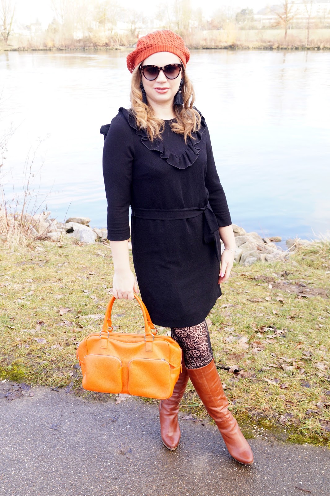 I didn´t wear a coat in my look but I have worn this beautiful black dress with ruffle detailing on the collar and a waist belt. The dress is old, I got it from a sale some years ago but still love the style.