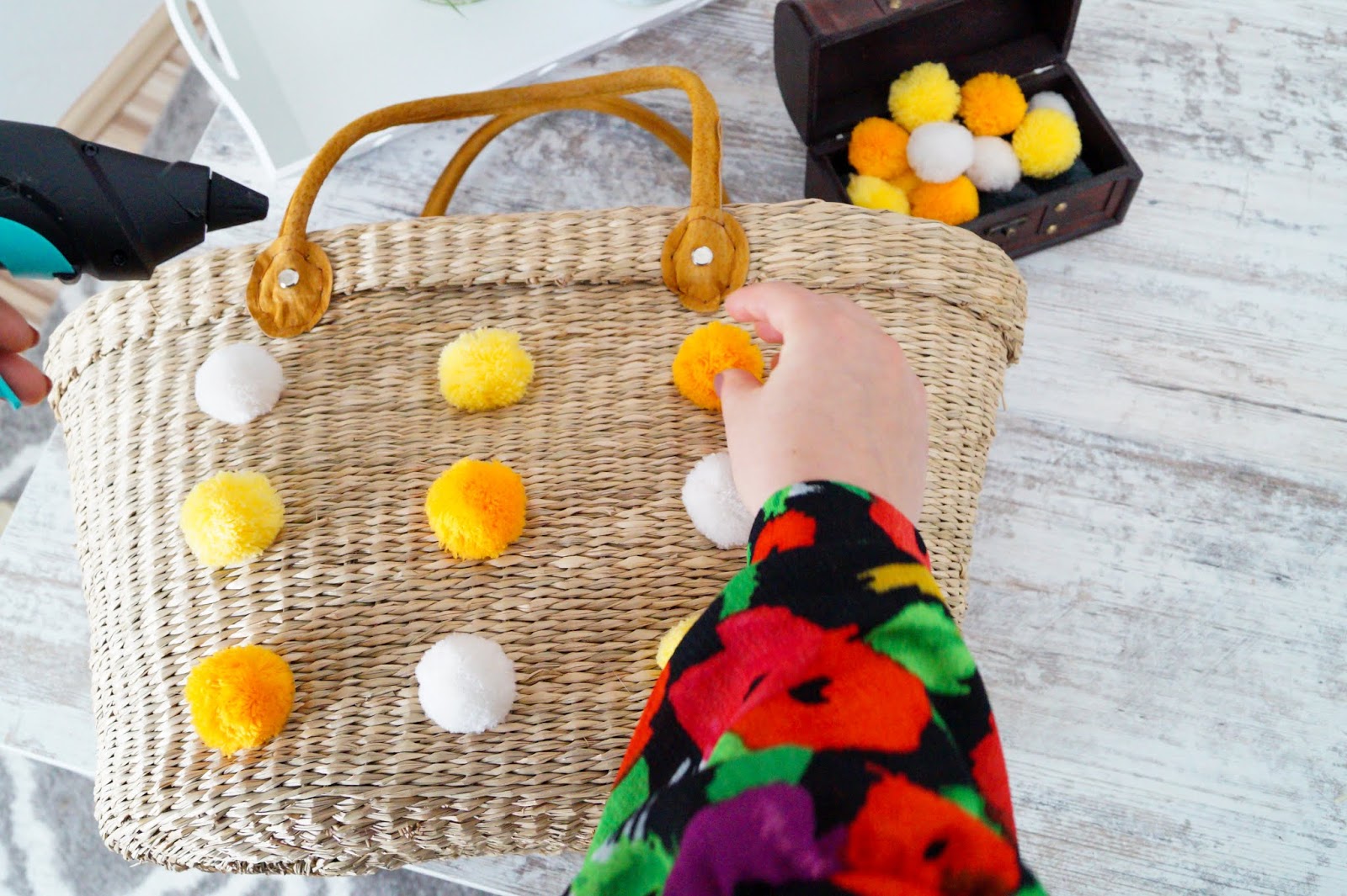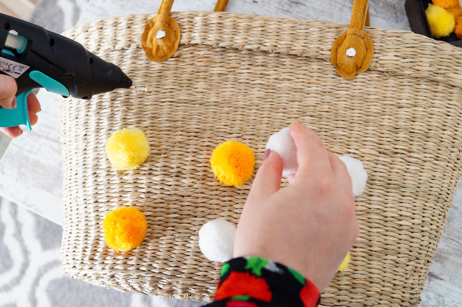 Glue them onto your straw bag and let the glue dry.