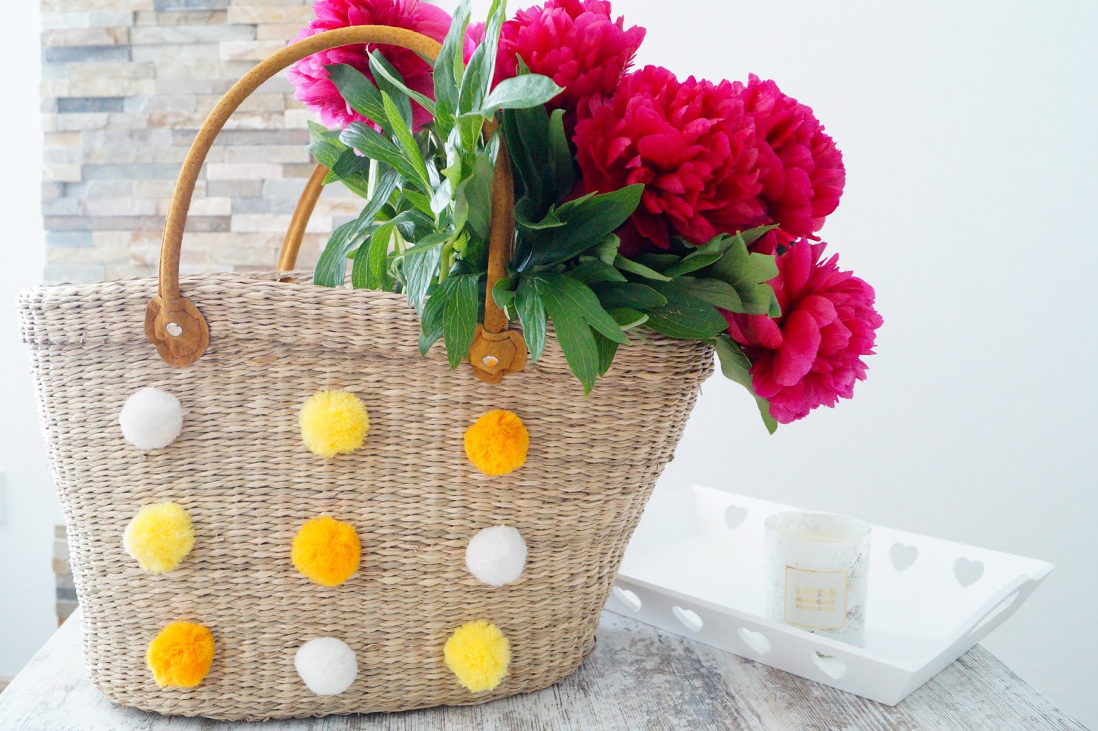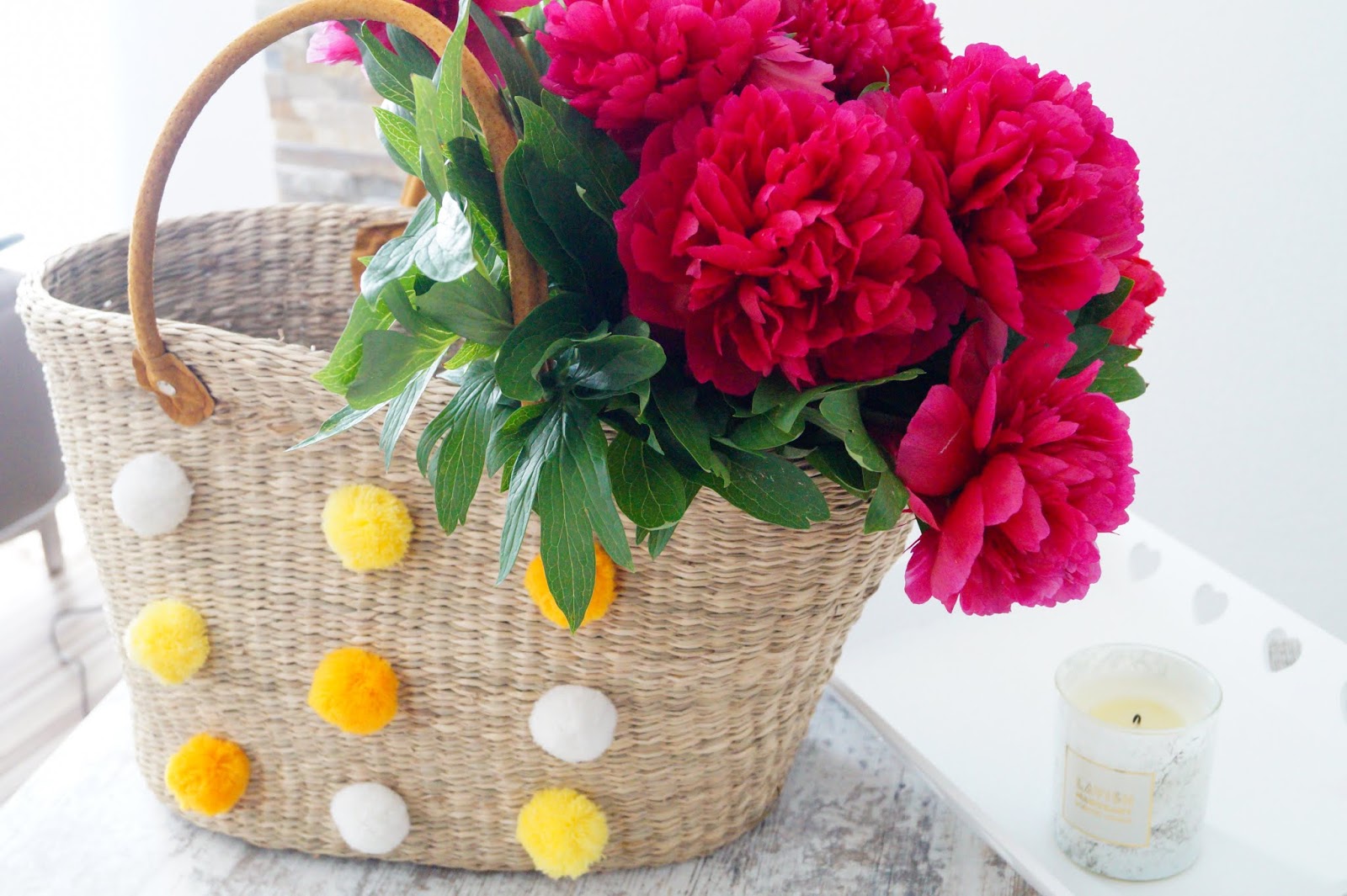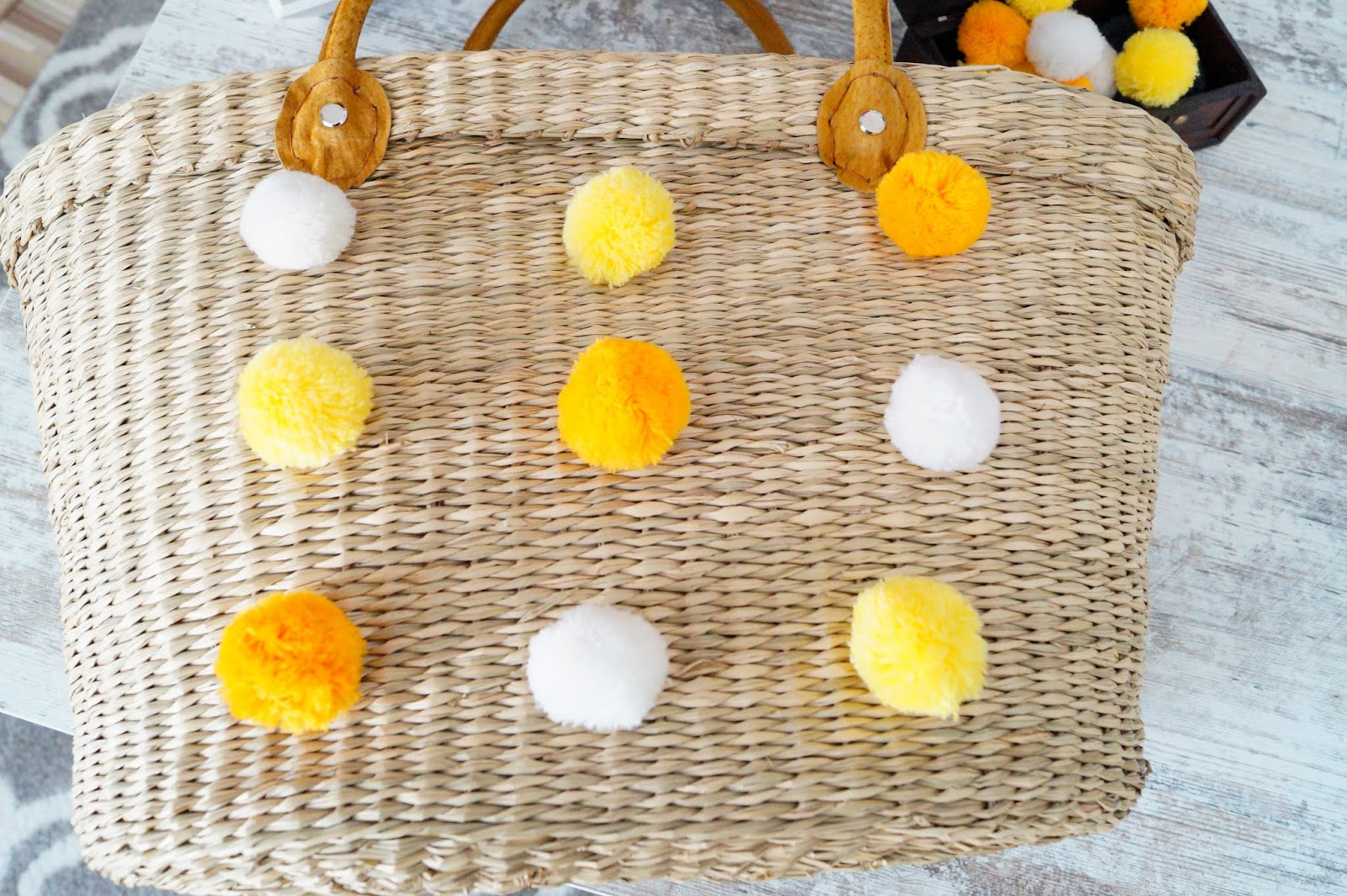 In fact I don´t want to pay 200 to 300 Euros for those kind of bags so I searched the Internet and I decided to make one by myself. You just need two things. The straw tote and the pompoms. The tote is from amazon. You can find one here, here and here and the pompoms are from Etsy. They are available in every color and every size.