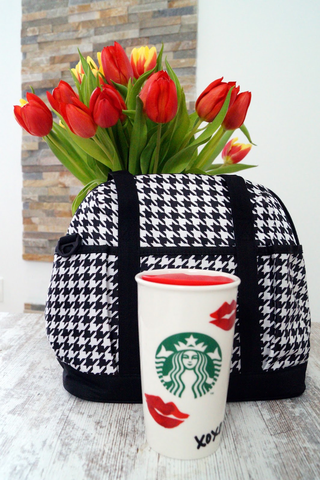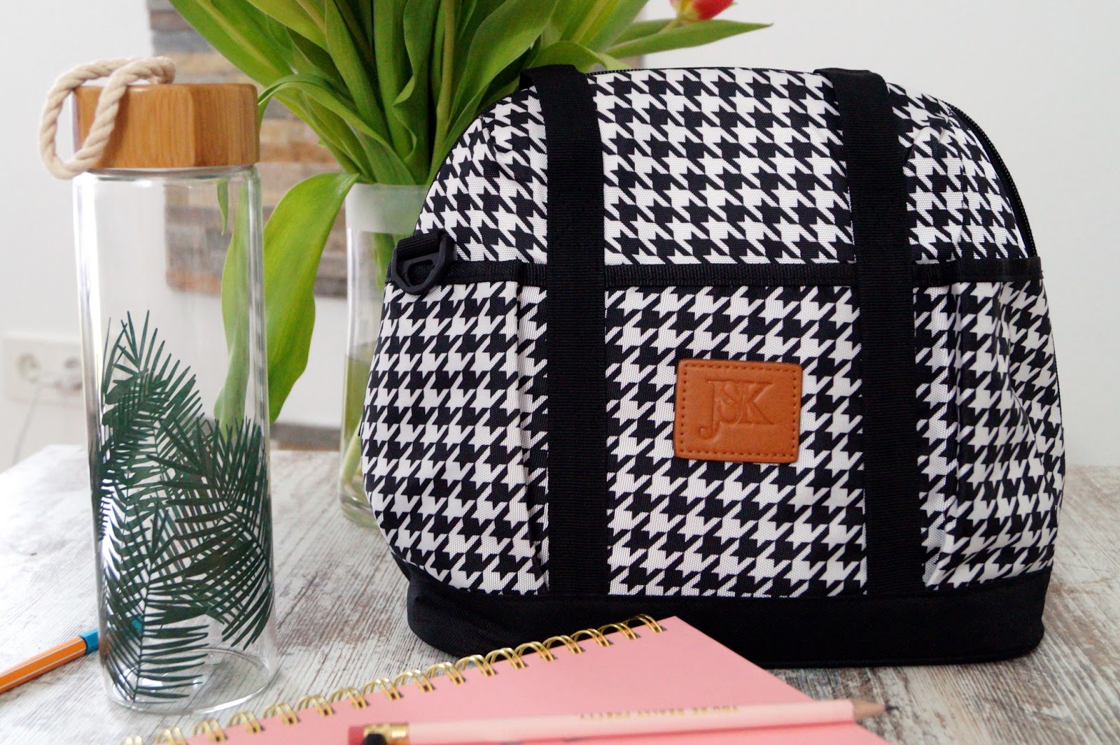 Usually no one takes a lunch brake (don´t know why cause this would be really nice, eat together and chat a little) so I am bringing my food with me (there also isn´t a place around where you can get something to eat – like nothing). I recently got this lunchbag from JSK via amazon with this super fashionable houndstooth print. It has enough space for my lunch, my smoothie and even a small bottle of diet coke and some fruit. It is insulated from the inside so this cool or warm your stuff.