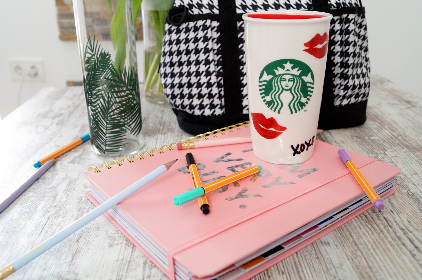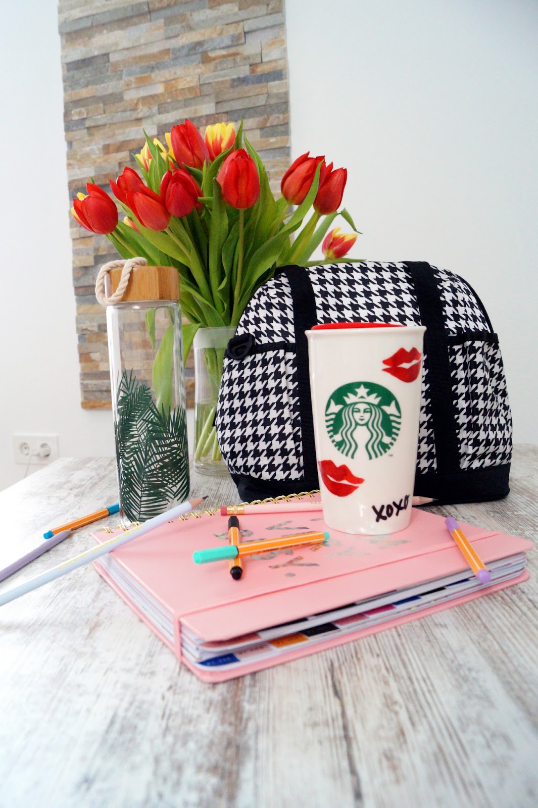 lunch bag JSK / mini fineliner amazon / planer 2018 ban.do via Asos / water bottle Depot / mug Starbucks similar here