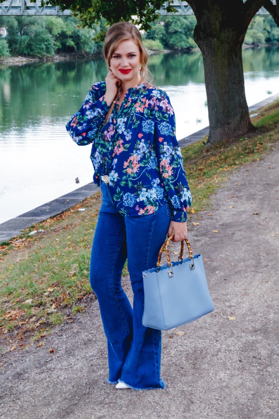 I paired it with this gorgeous pair of flared denim in the same hue. Totally loved the look of an all blue outfit combination. But it would also look adorable with a pair of white pants and booties for a more western kind of style. Since there are so many colors incorporated in the pattern there are also lots of possibilites to style it.