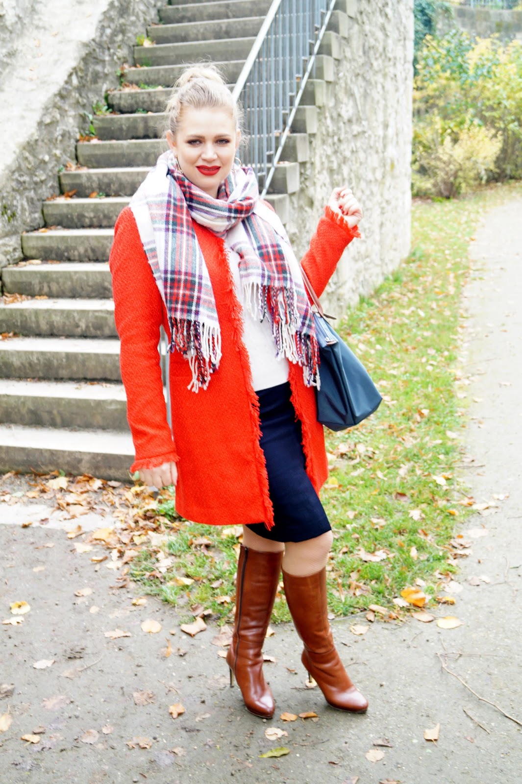 I opted for a red coat for this look. The creme pullover and the navy pencil skirt needed some spice so I added a plaid wool scarf with a blue, green and red pattern and this beautiful red coat. Unfortunately this is only suitable for fall cause it isn´t really warm and it doesn´t close so well. Only has hooks but I am never closing my jackets so I am fine with that.