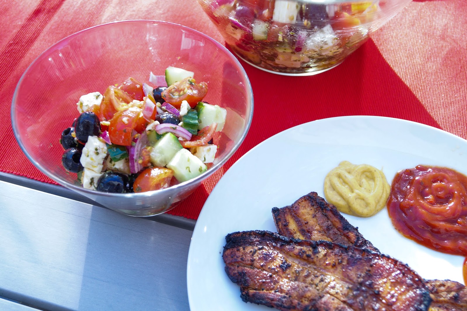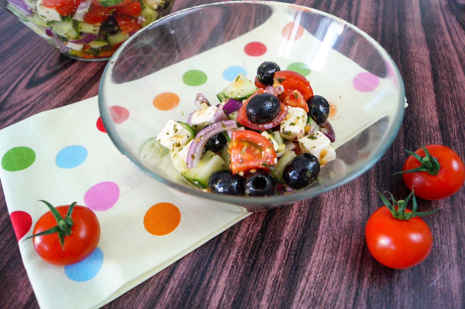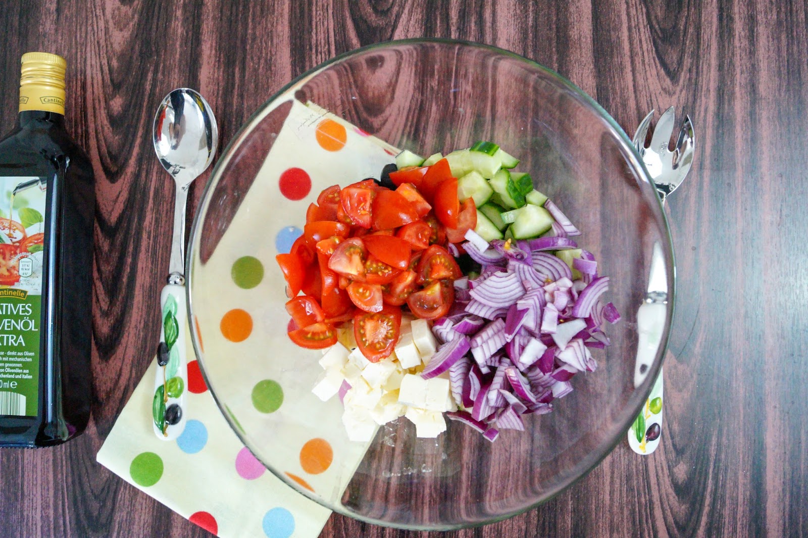 we are in the middle of BBQ season so I am sharing some I am sharing a bunch of easy and quick side dishes the next weeks. Today´s recipe can´t be exceeded in its simplicity. A super easy and super quick Greek Summer Salad.