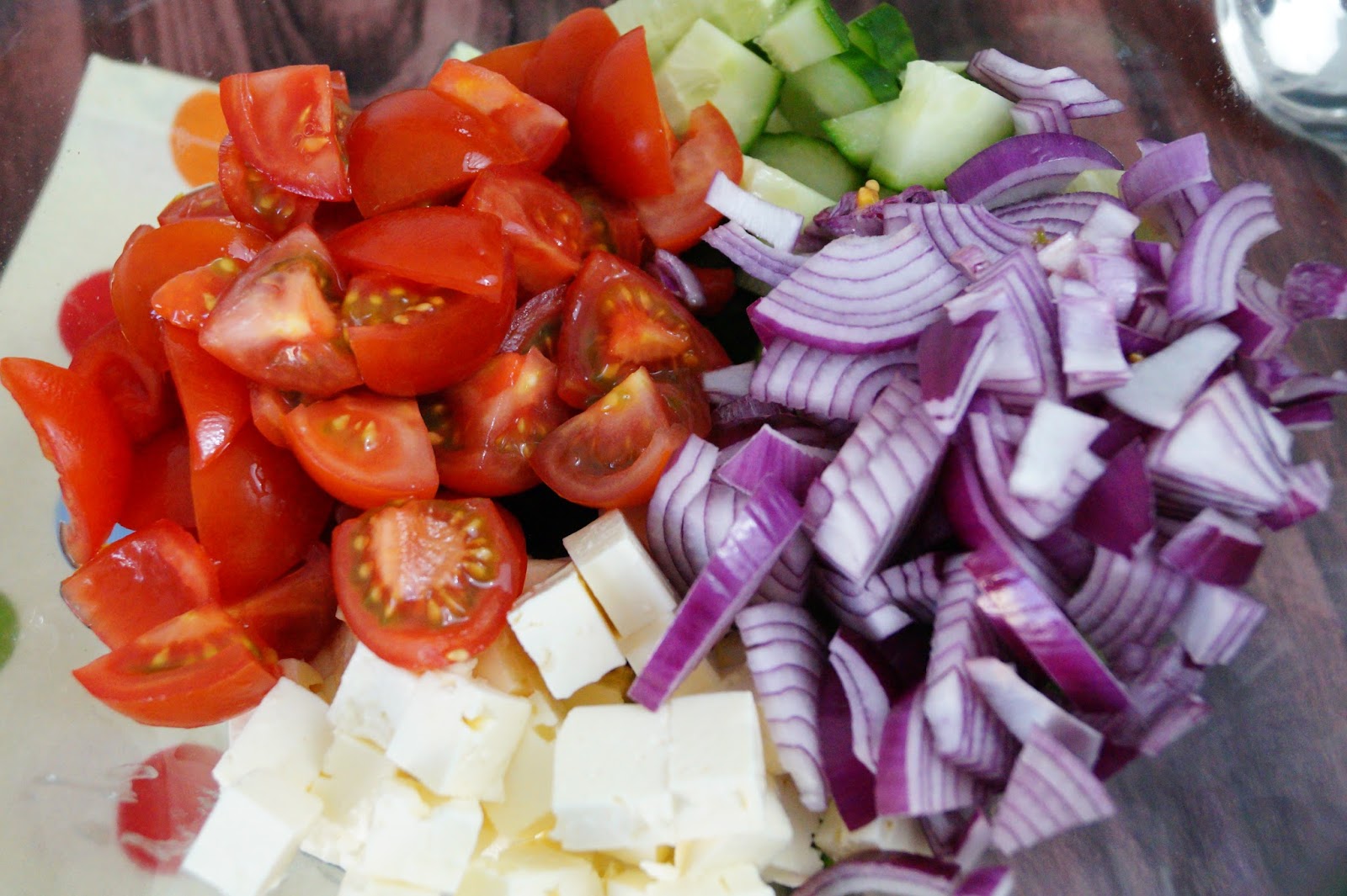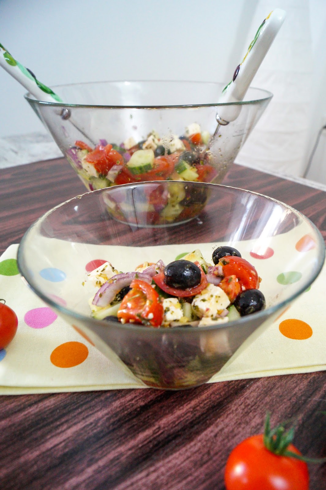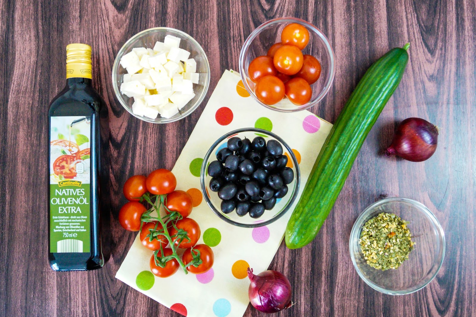 we are in the middle of BBQ season so I am sharing some I am sharing a bunch of easy and quick side dishes the next weeks. Today´s recipe can´t be exceeded in its simplicity. A super easy and super quick Greek Summer Salad.