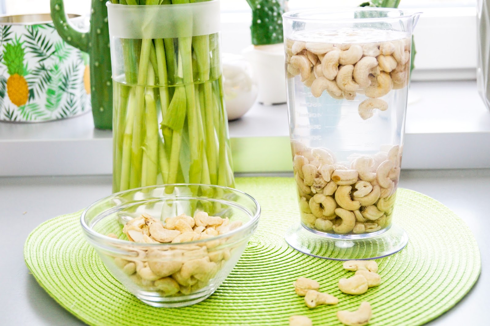 The recipe is really simple. Step one is to put the needed amount of cashews into a bowl of water and let them soak for about 4 hours. I always take one cup so I have at least a little meassurement.