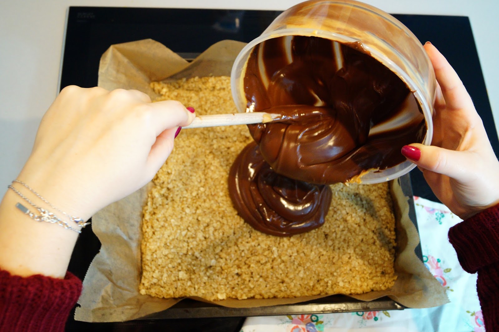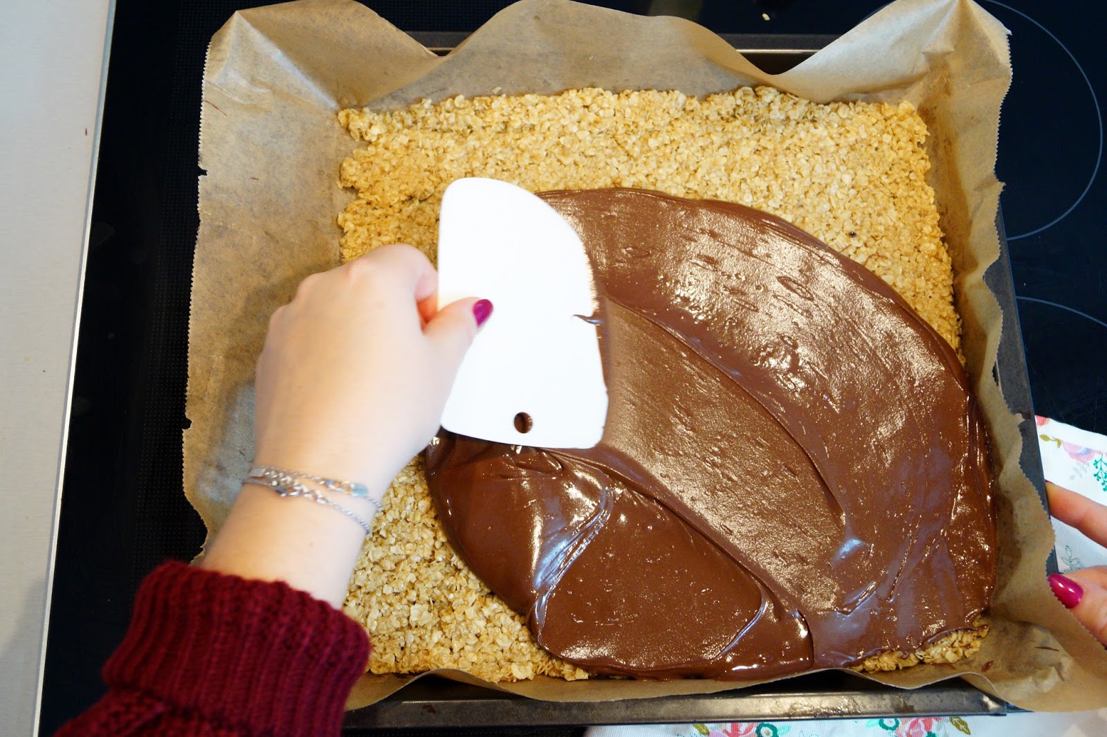 ^put other half of the oats onto the chocolate mixture and press until evenly^