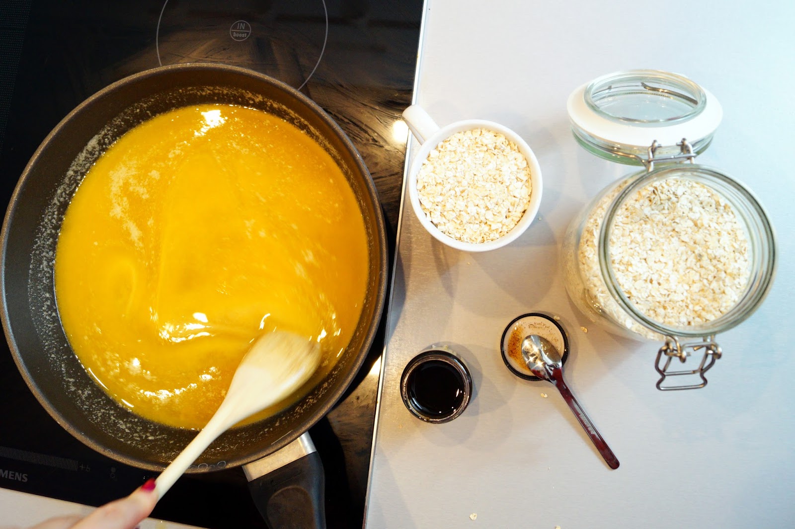 ^put the butter, brown sugar and vanilla extract into a pan to medium heat and stir until sugar is melted^