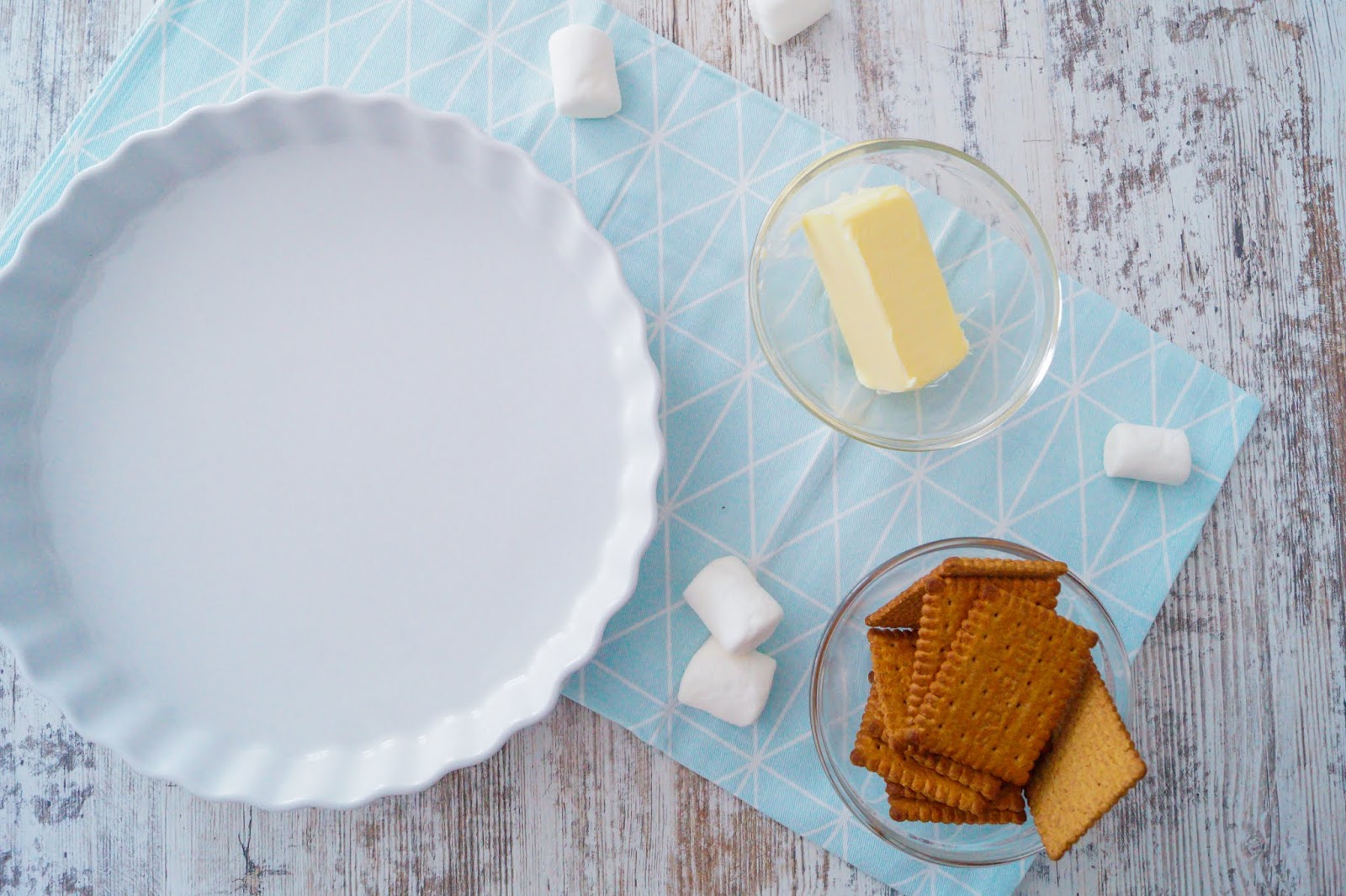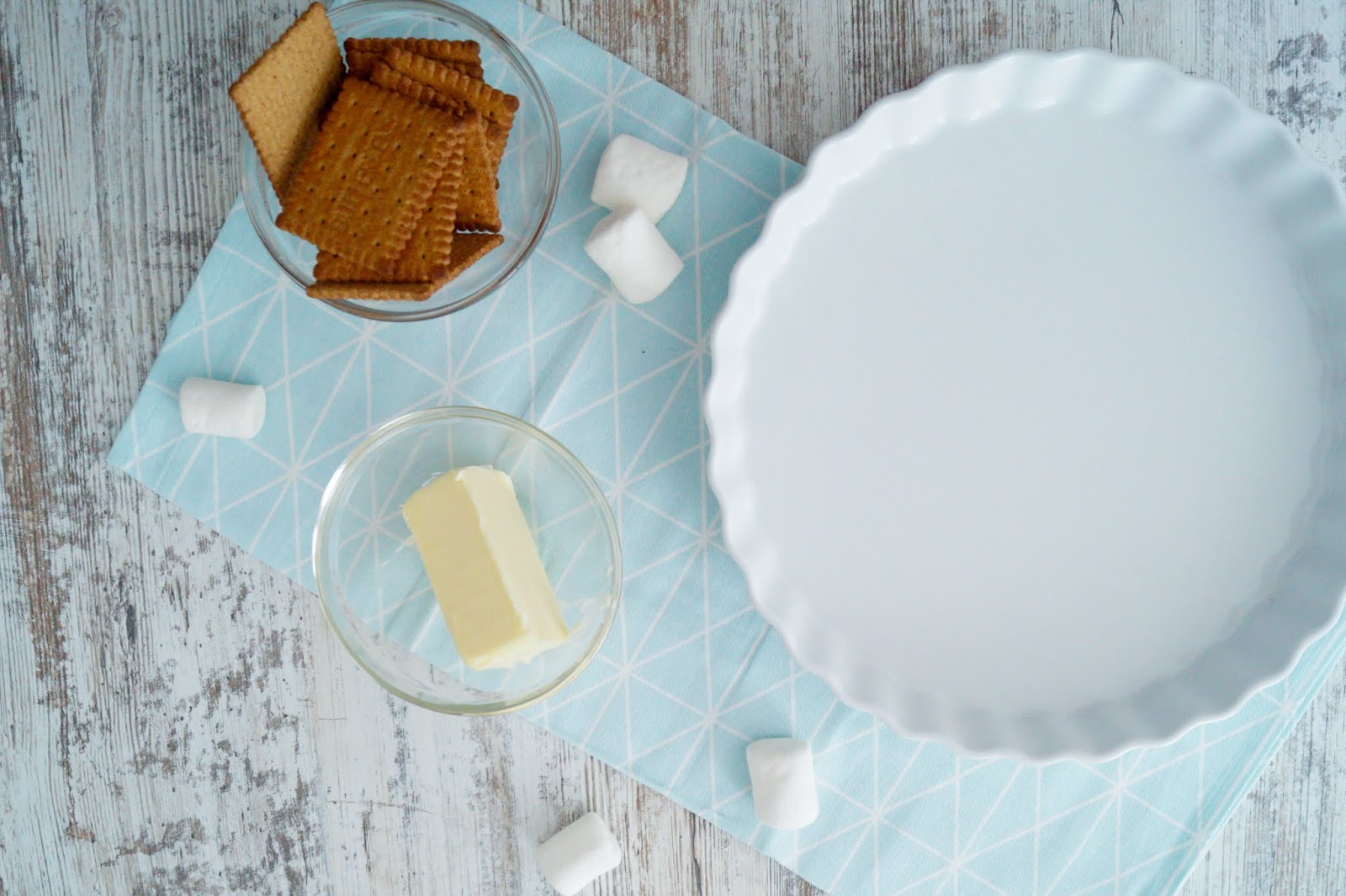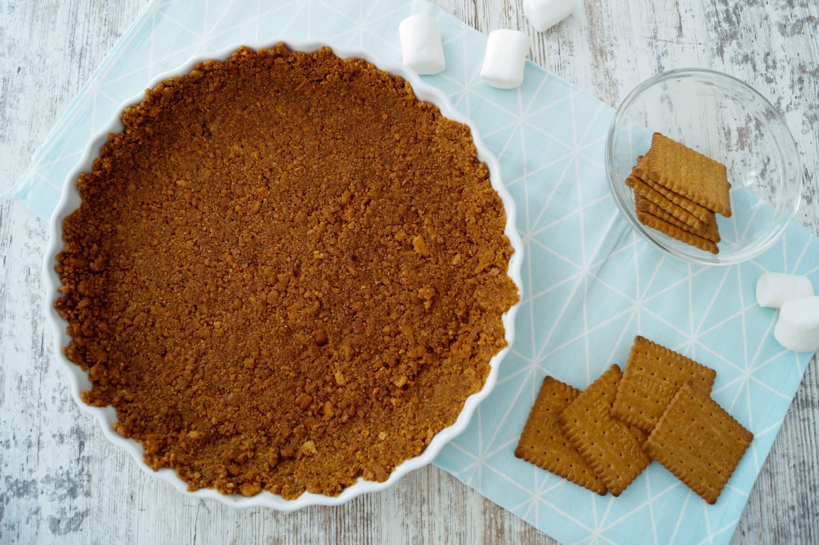 – melt the butter and crumble the crust, stir together and push into your pie pan