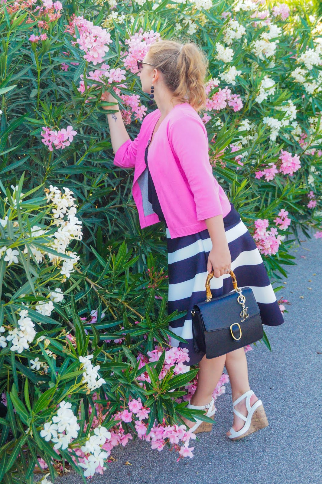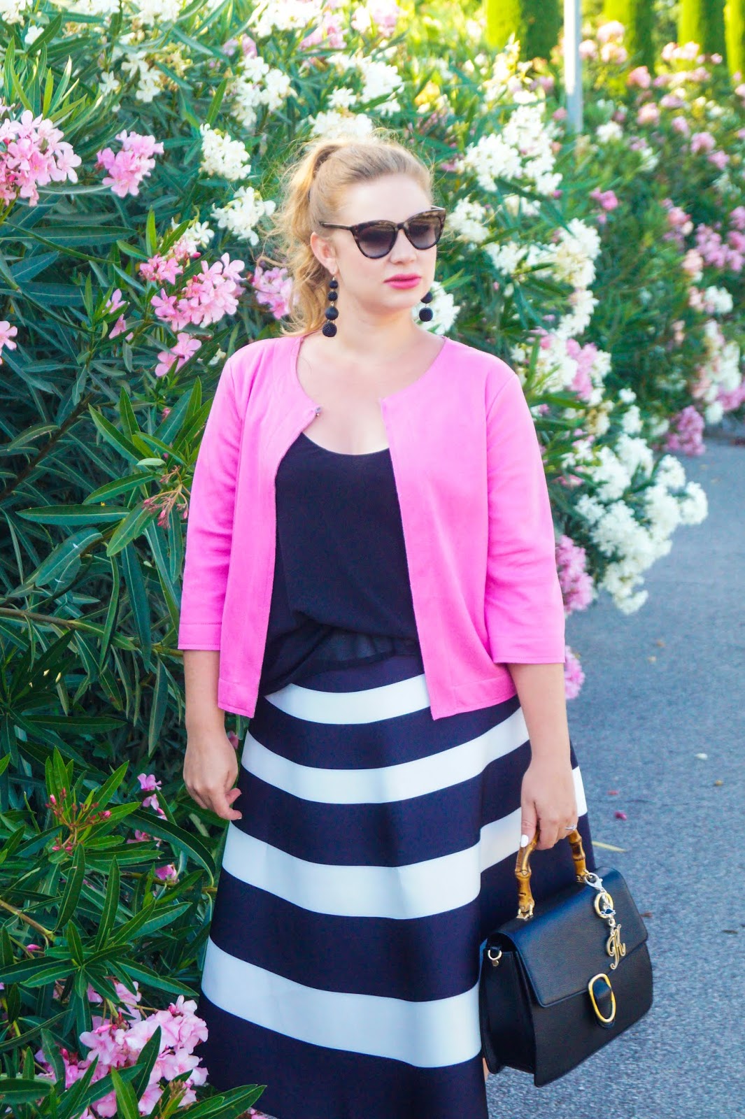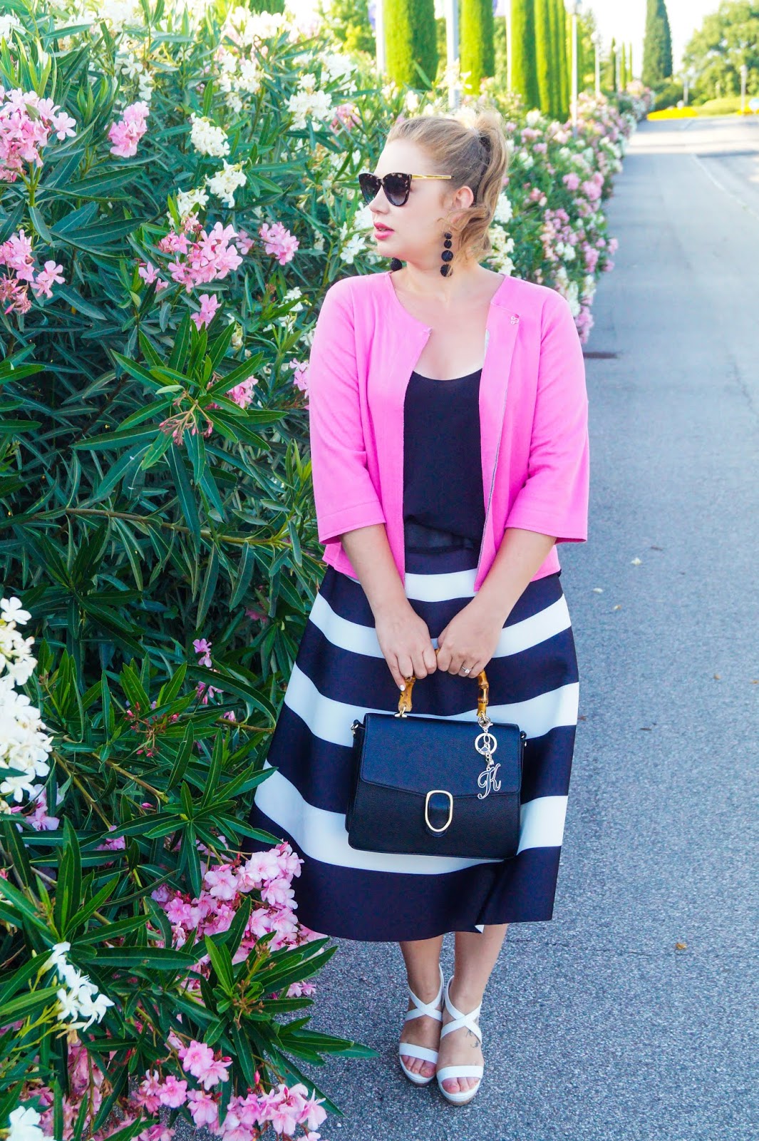A black and white look is one of the most versatile you could wear cause it allows you to add any color you like. Whether it is a royal blue or a sunny yellow or in this case a Barbie pink.