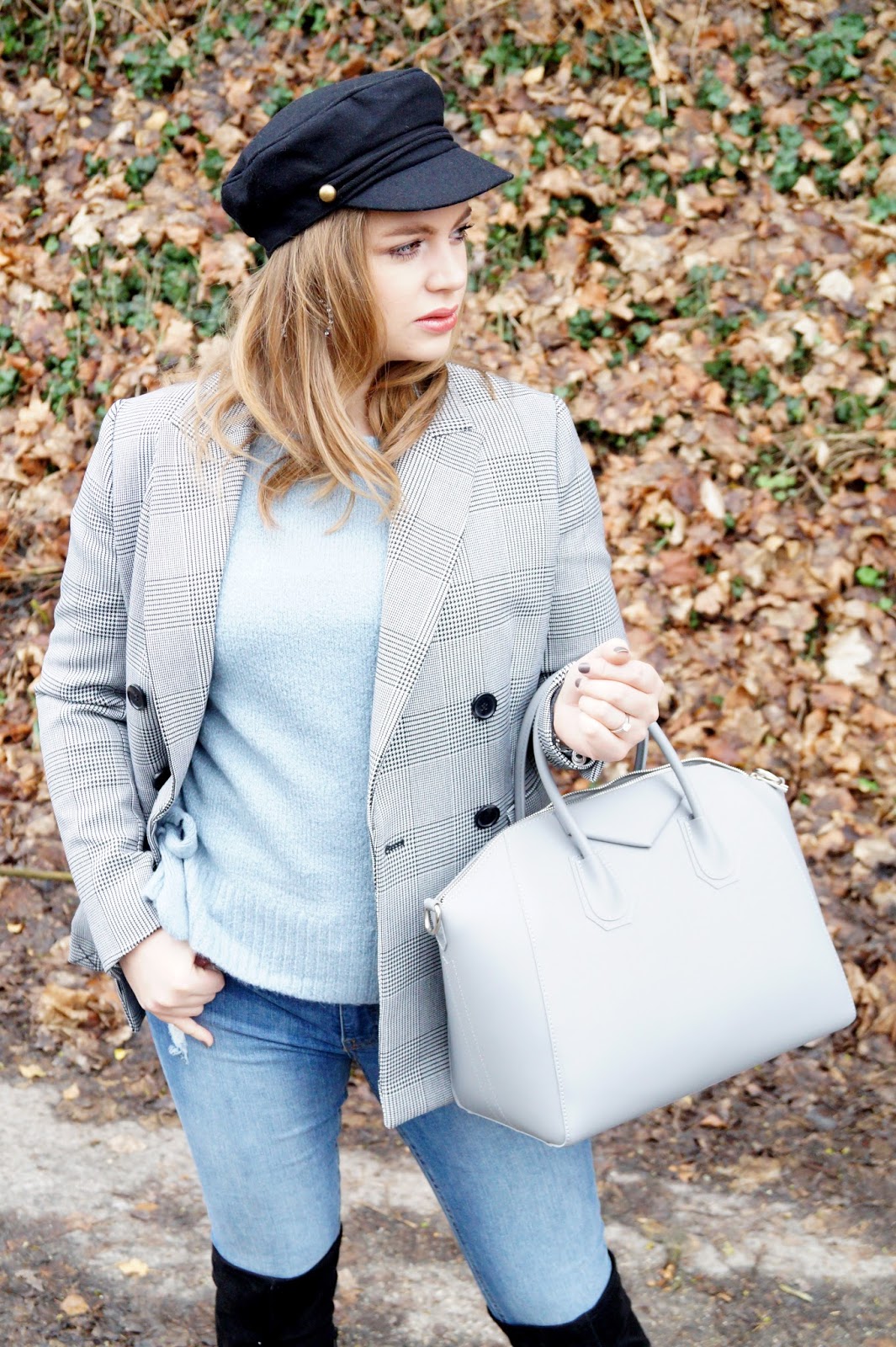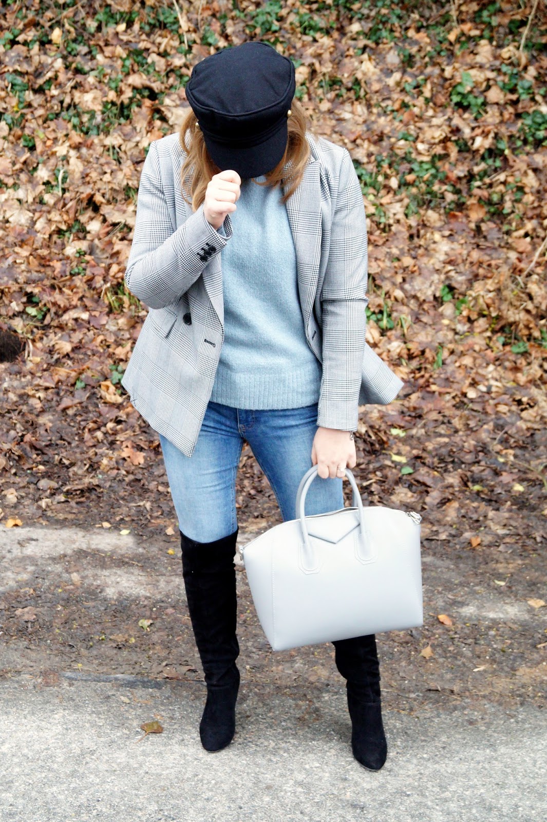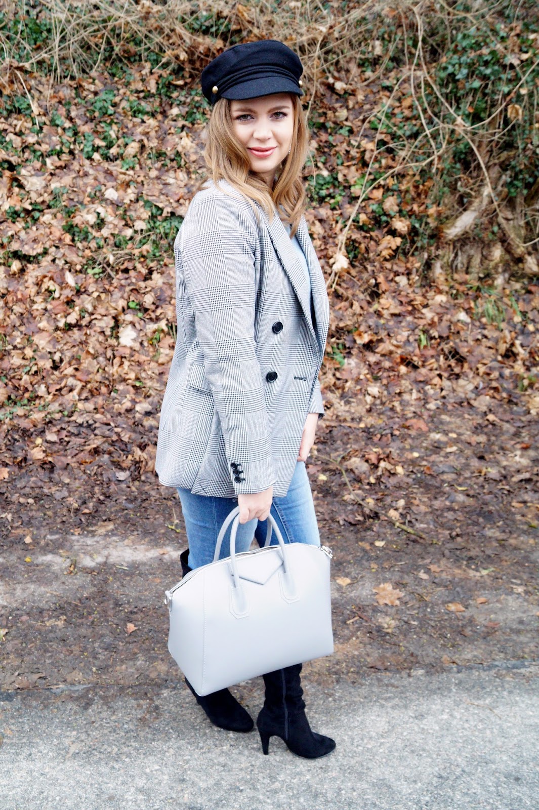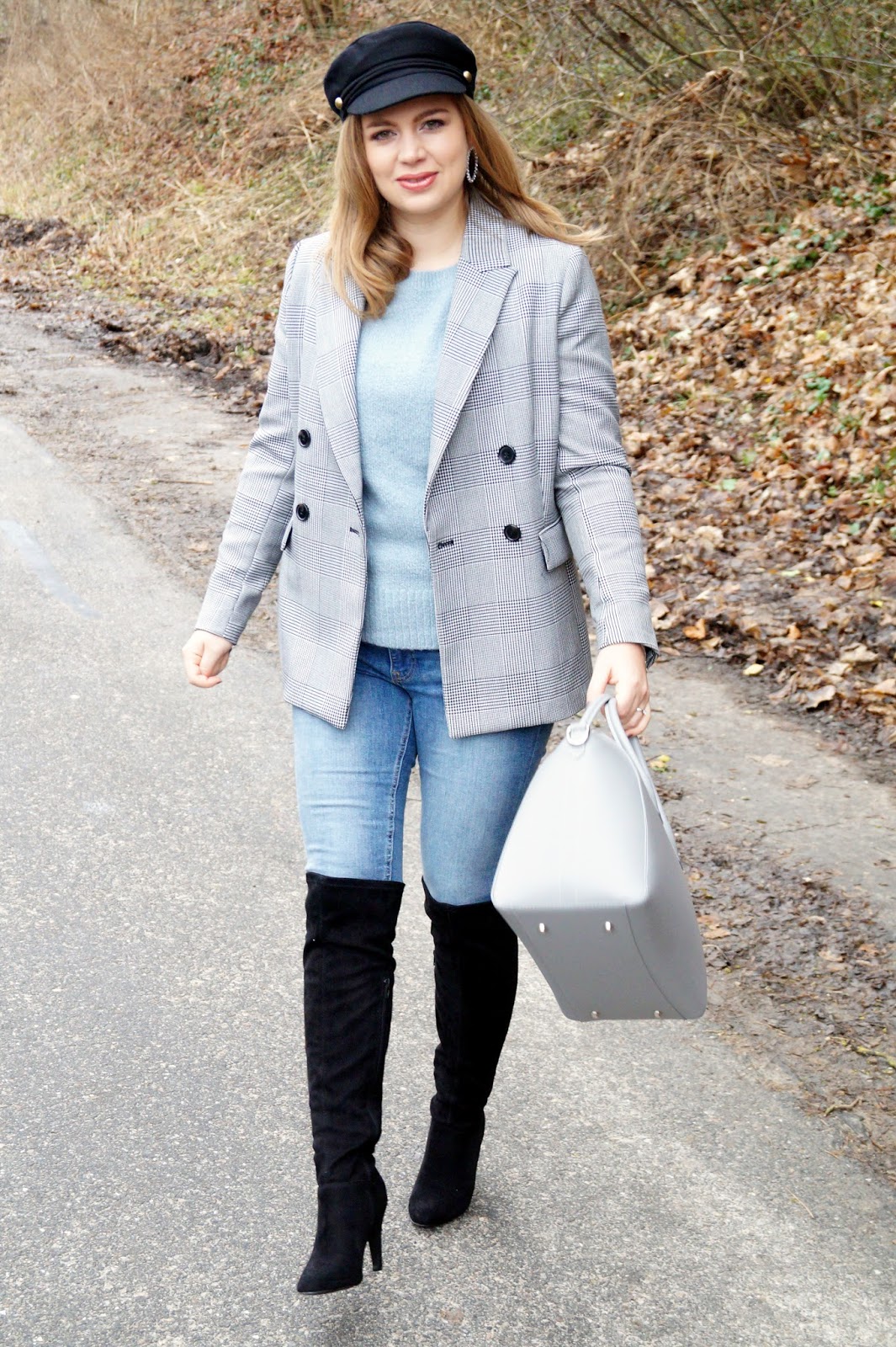 glencheck blazer H&M / pullover H&M sold out similar here and here / earrings H&M sold out similar here and here / denim H&M sold out similar here and here / otk boots Wallis Paris similar here and here / cadett cap H&M sold out similar here and here / bag Fashion Drug