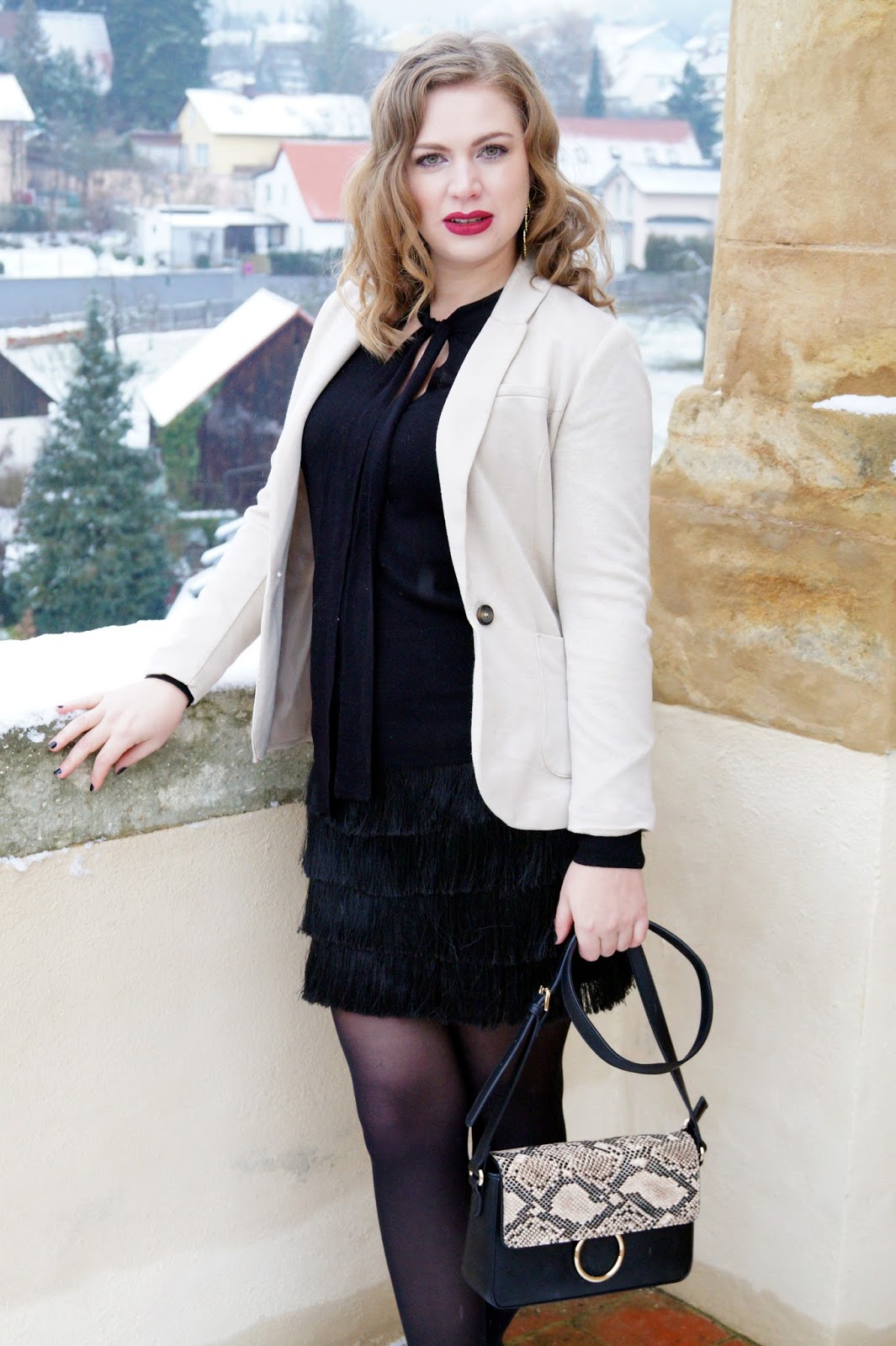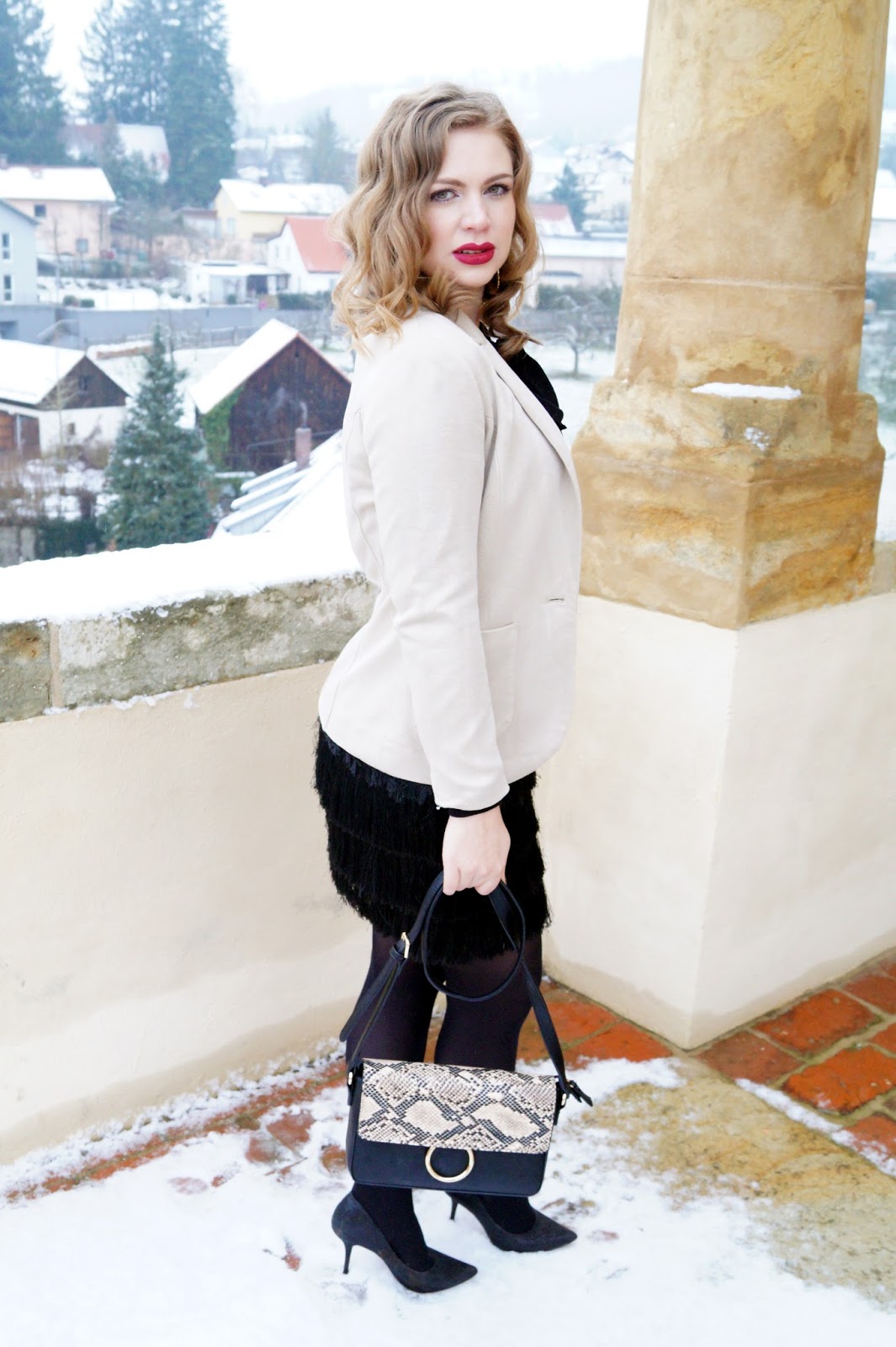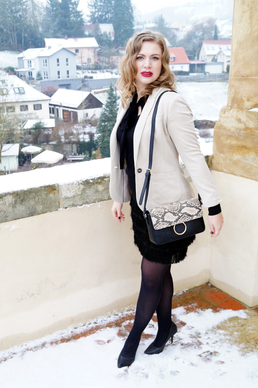 The fringe skirt is from H&M and I wanted one since I had seen one on a blogger last year. It is just too cool. Everytime you move the fringes do as well, one of the reason I love the „Charleston dresses“. It is flowy and festive and looks so cute. I paired it with a black pussy bow tie pullover and a blazer jacket. The blazer jacket has little golden particles woven into the material.