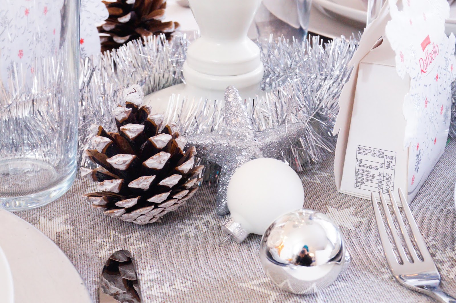 So for the decoration I added a silver garland to beginn with. In the middle of the garland I put the candle holder including gray candles. For the rest of the table decor I opted for silver and white ornaments. I really love decorating with ornaments and since there are so many different shapes and colors it will probably never get old. To add some wintery and frosty feels I got a bunch of pinecones from our drug store and also a little wodden sleigh and glittery trees.