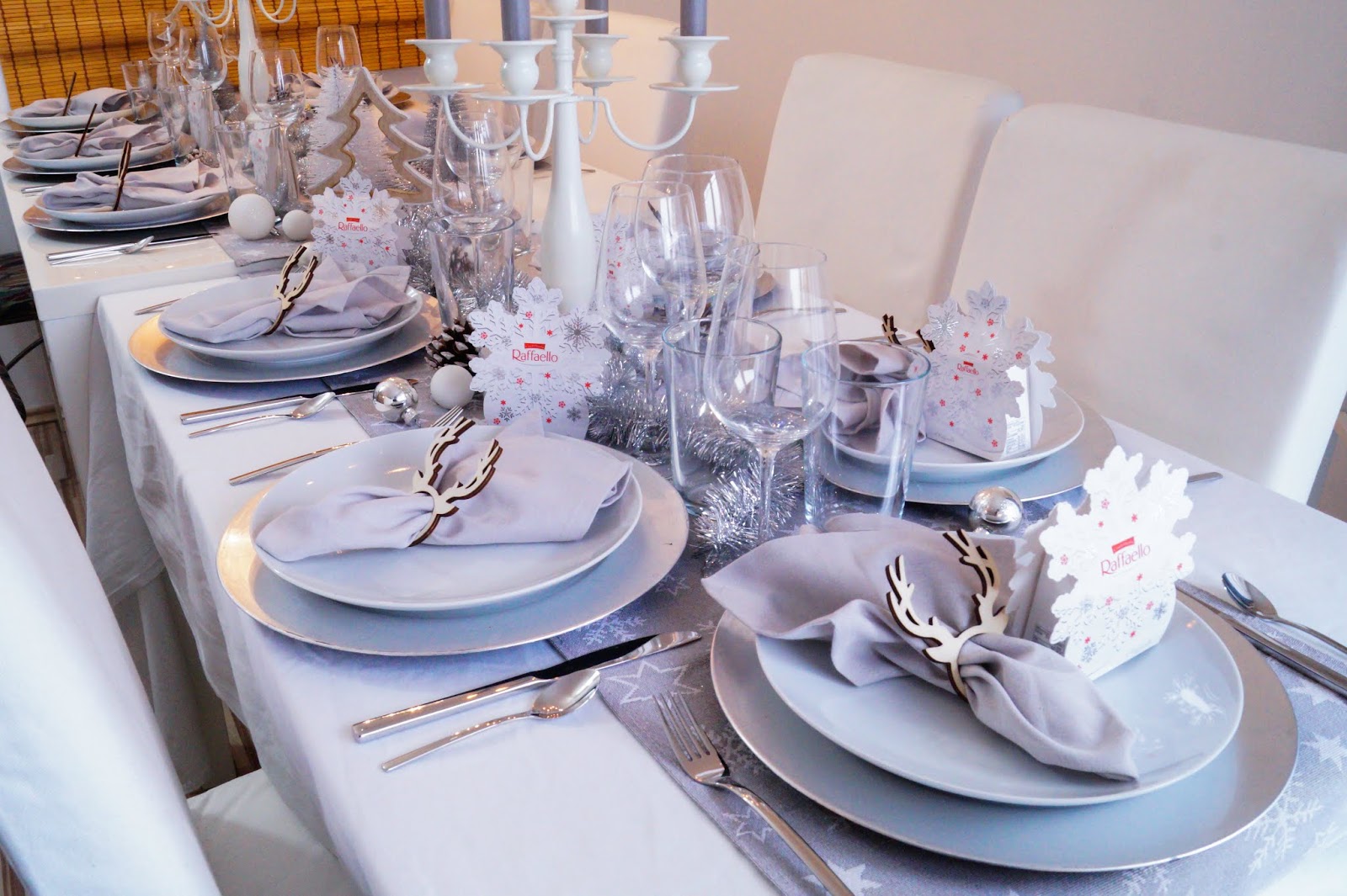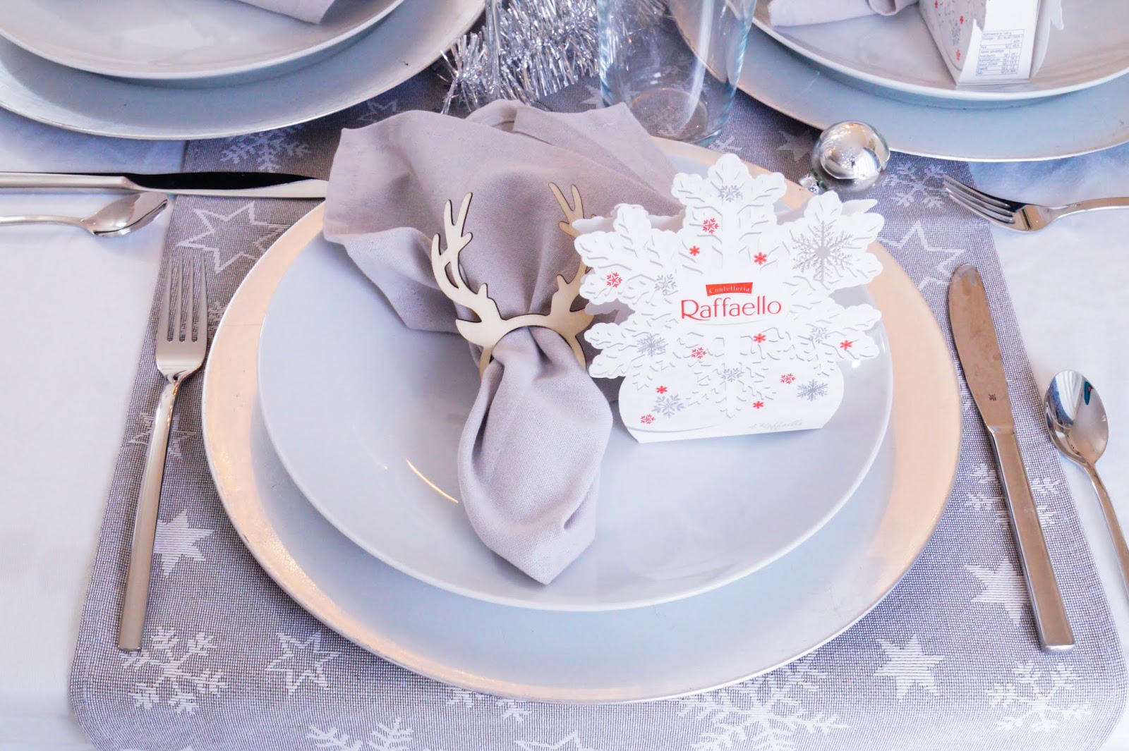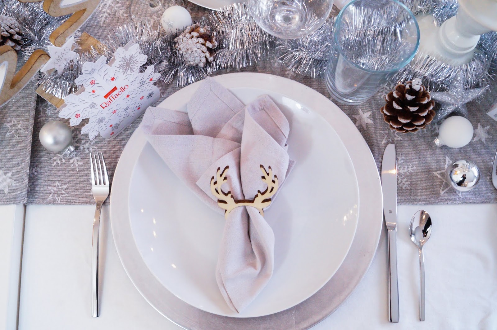 I went with gray table runners speckled with white stars and snowflakes all over. To stay in the theme the platters where also silver as most of the table decor. The cotton napkins are also a light hue of gray. Meanwhile I prefer cotton napkins over disposable ones cause you just need to wash them and they are ready for their next use. Aaaand they add a much more luxe look to the whole table. The napkin rings are the most funny and pretty I have seen in a while and they completed the theme perfectly.