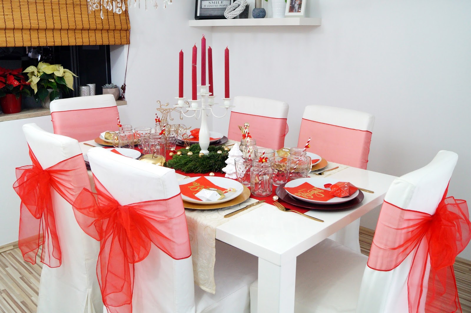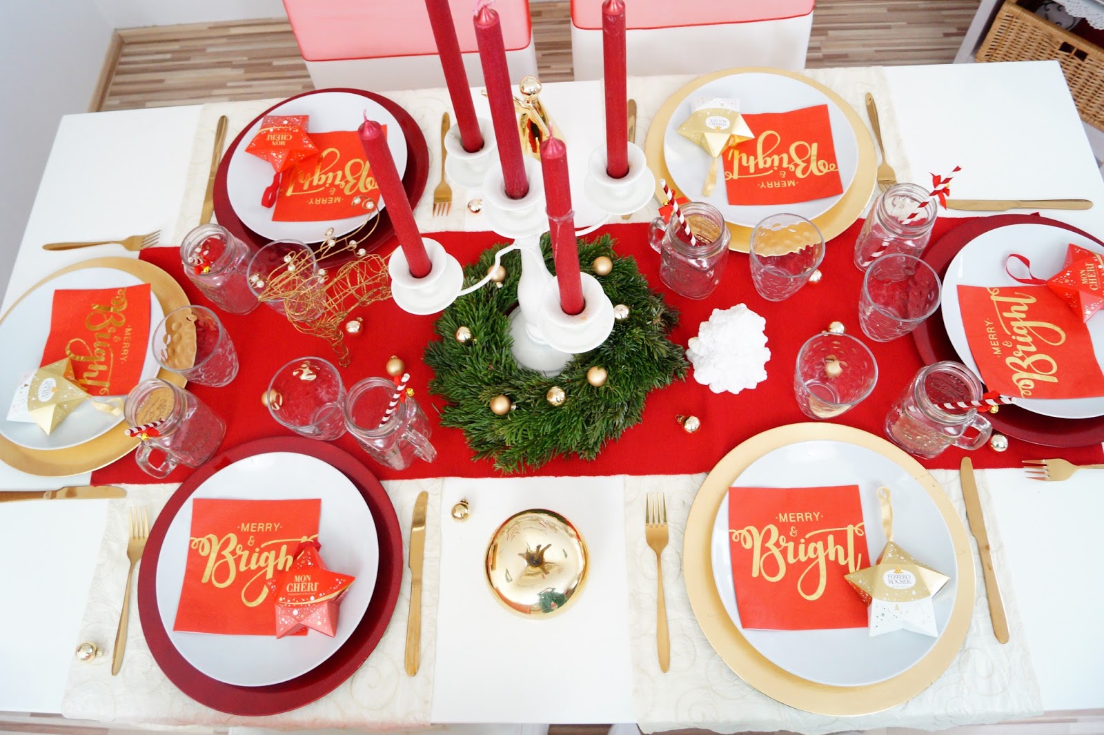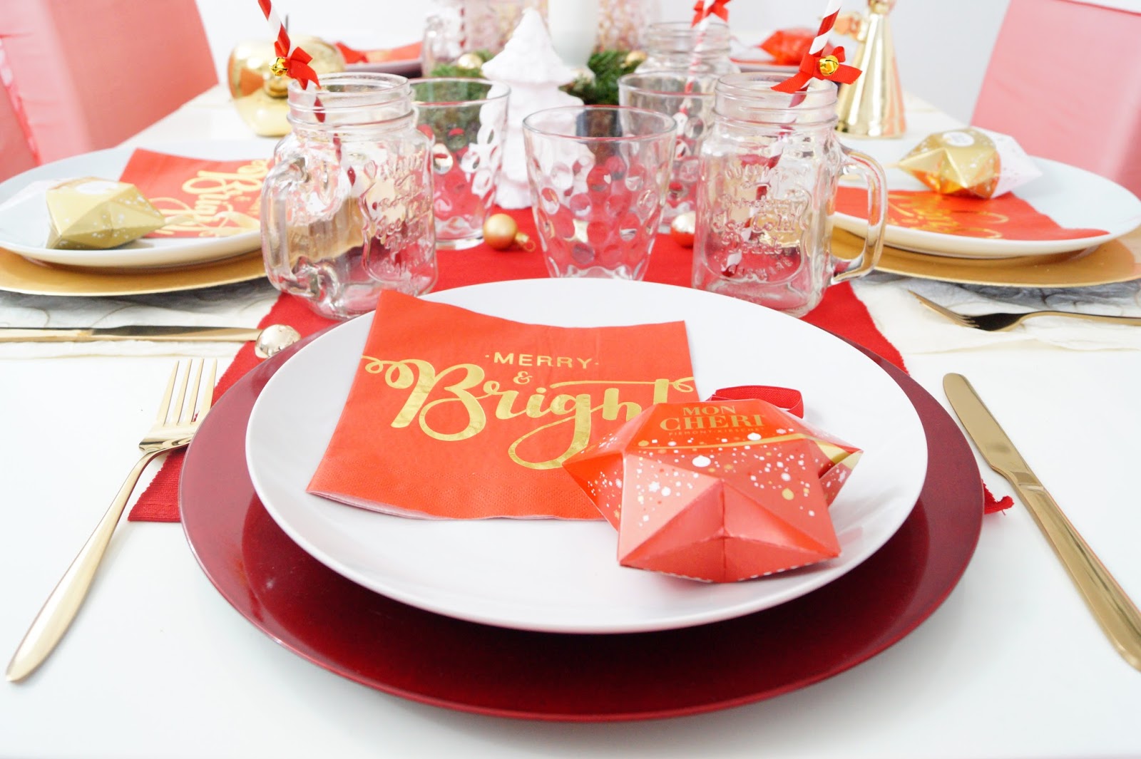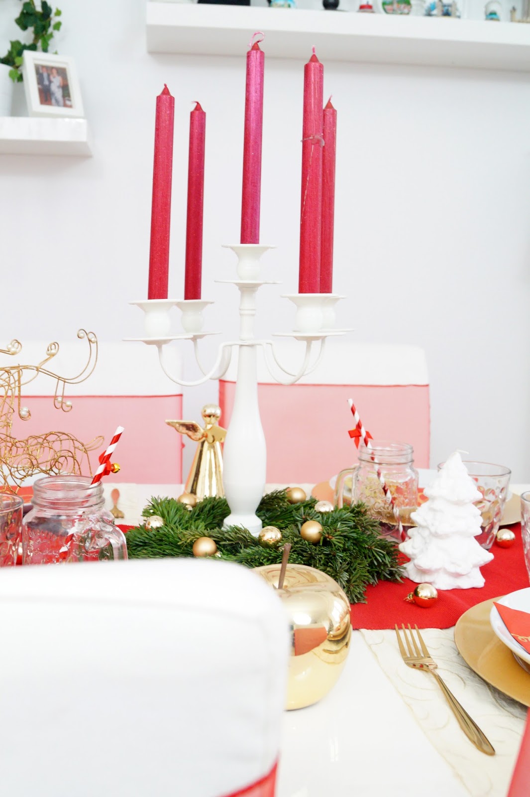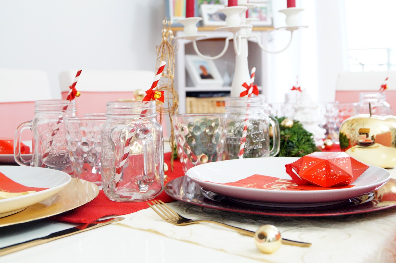 table runner cream old similar here / table runner red similar here / red plates Nanu Nana / gold plates Nanu Nana / golden apple similar here / golden reindeer similar here / golden angel Leonardo / cutlery gold similar here / golden Christmas ornaments Nanu Nana / candle holder Nanu Nana / candles Nanu Nana / napkins Pink Dots / mason jars amazon / paper straws Pink Dots / plates / tray / glas old similar here / red bows on chairs amazon