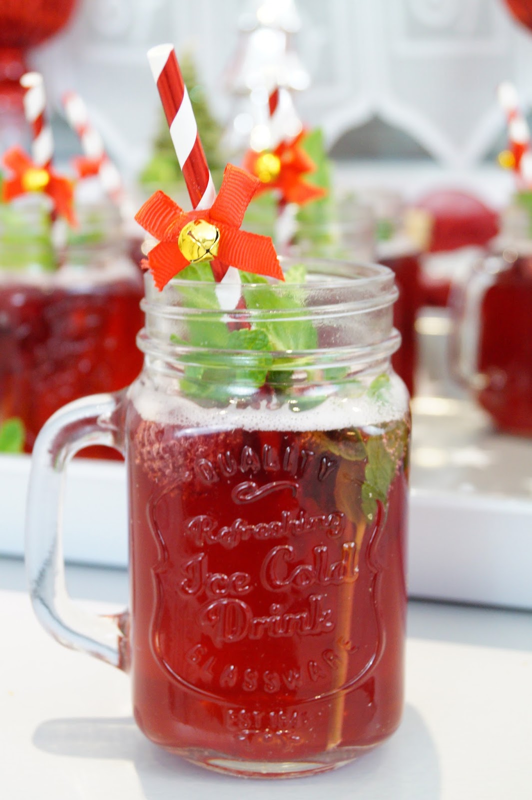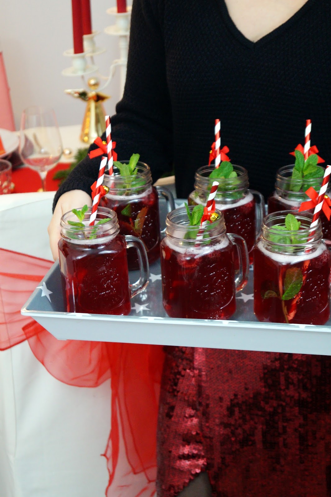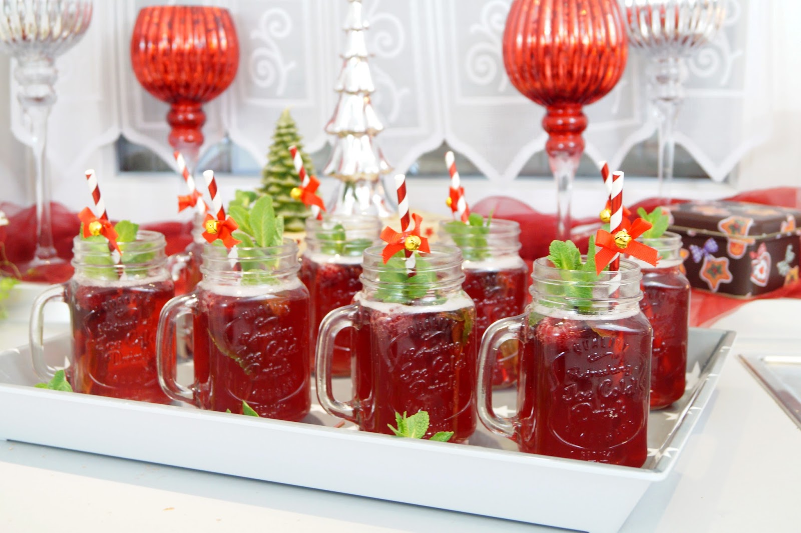 I made cranberry mimosas as an aperitif which turned out really good. It is a pretty simple recipe. Just mix champagne and cranberry juice how you think it tastes best. This way you can decide on your own if you like it either light or strong. I mixed ones bottle of chamgagne with one bottle of cranberry juice. For decor and also for adding some flavor I added some mint leavs on stems and raspberries.