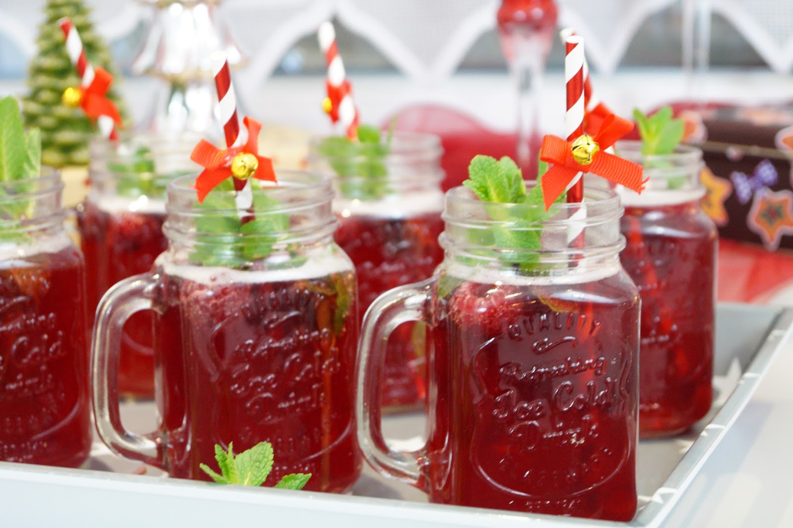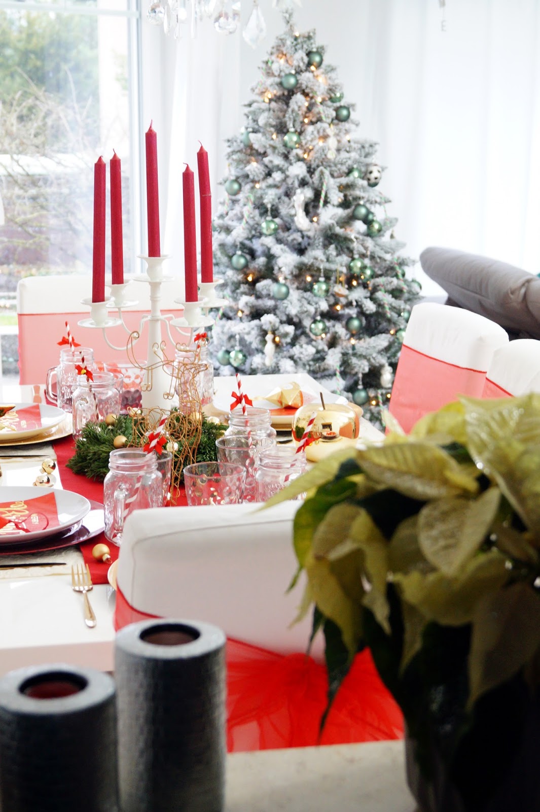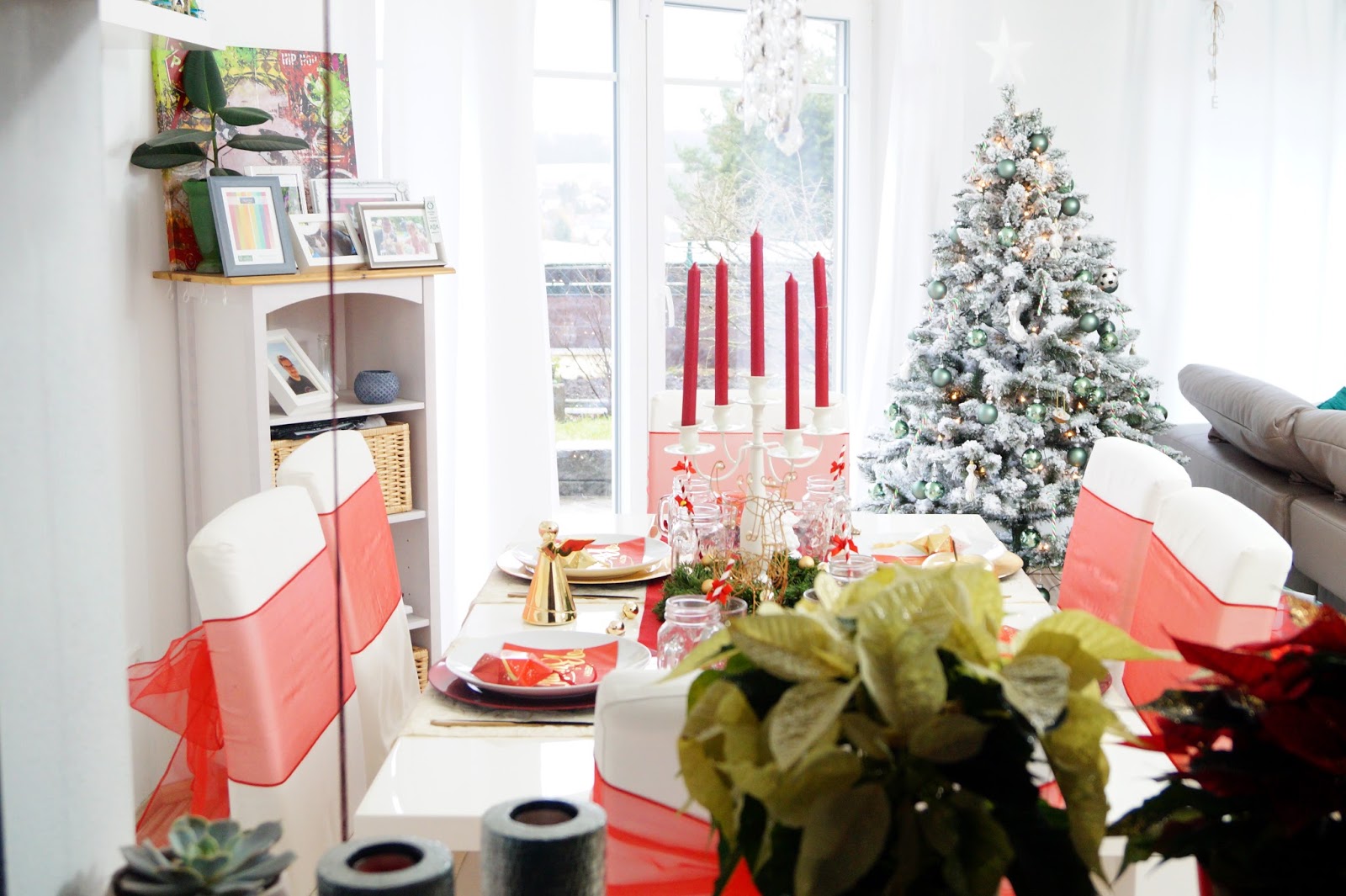 I made cranberry mimosas as an aperitif which turned out really good. It is a pretty simple recipe. Just mix champagne and cranberry juice how you think it tastes best. This way you can decide on your own if you like it either light or strong. I mixed ones bottle of chamgagne with one bottle of cranberry juice. For decor and also for adding some flavor I added some mint leavs on stems and raspberries.