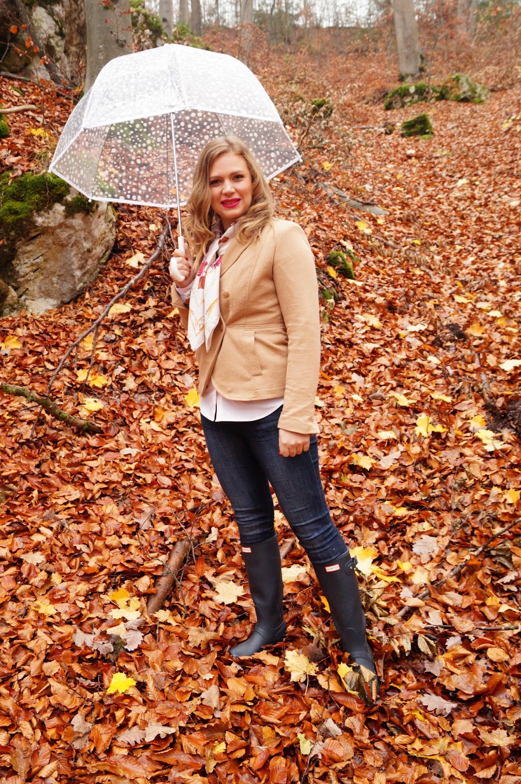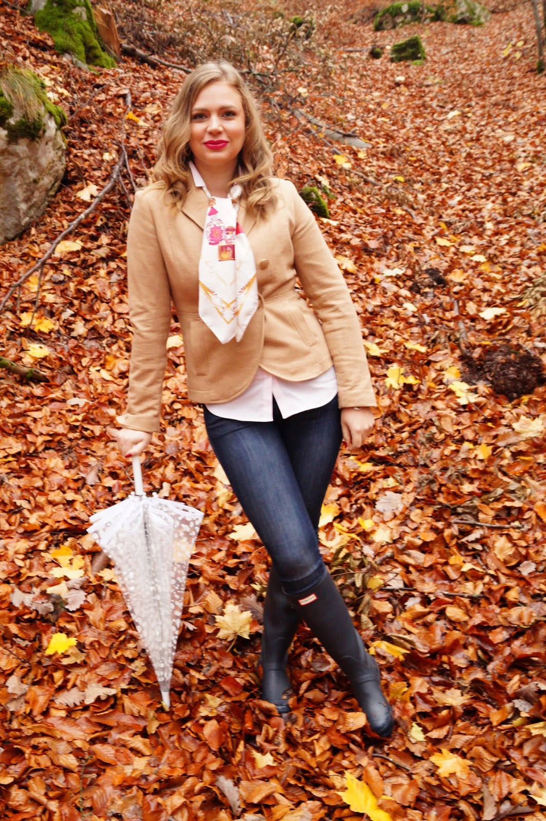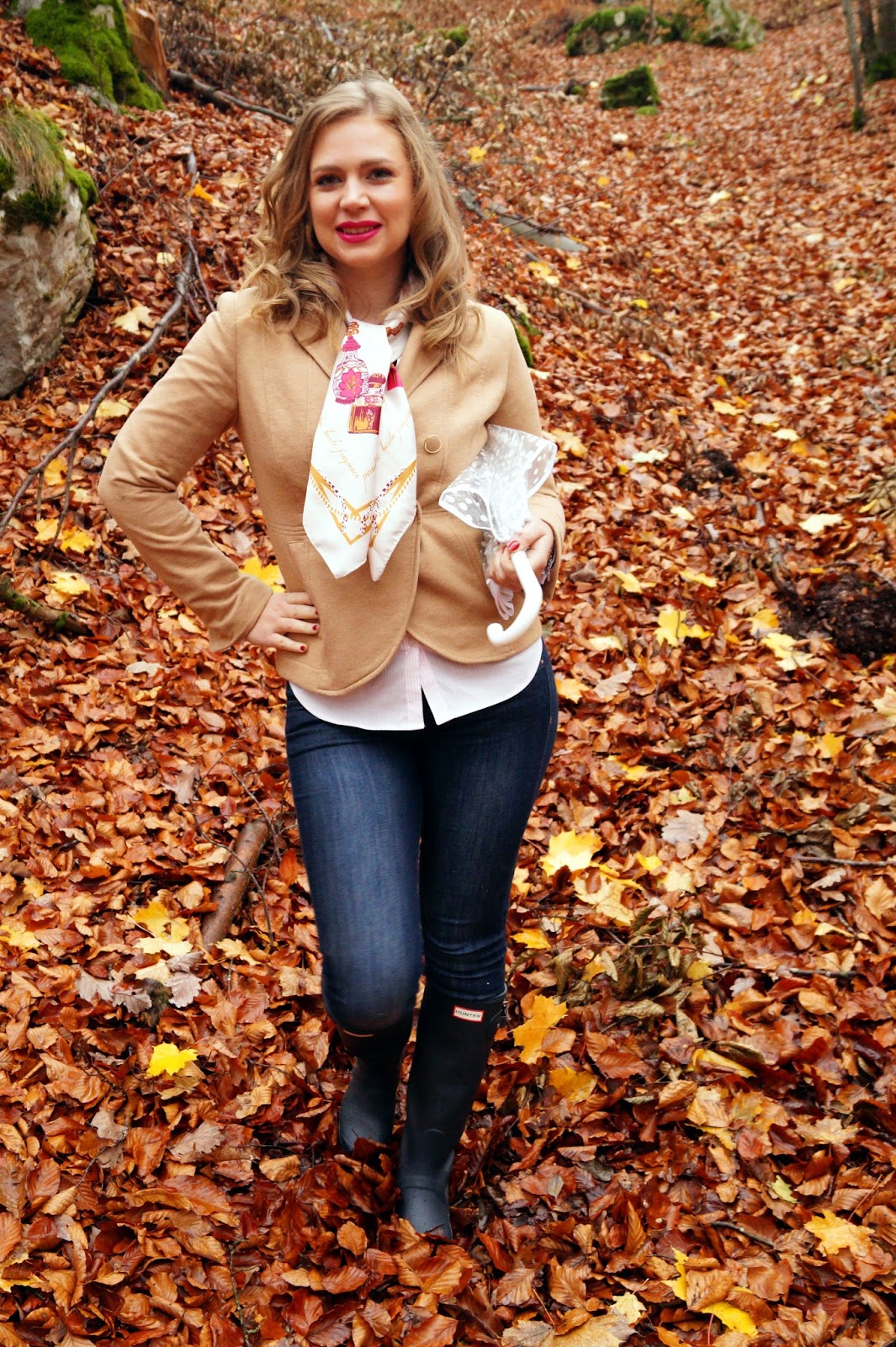 denim H&M old similar here and here / blazer H&M old similar here and here / silk scarf H&M old similar here, here and here / Hunter boots / button-down H&M