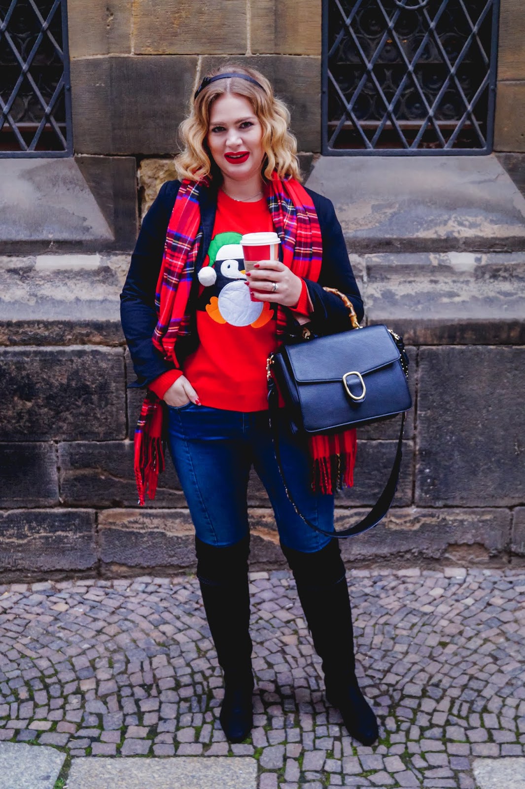 Red Christmas sweater with penguin imprint and pom pom (as seen above) // This is probably my most loved look. I paired the penguin sweater with a black boyfriend blazer. A boyfriend balzer is in my opinion the better choice if you want to wear your sweater underneath a blazer at all as it is made of a pretty thick material and believe me you still want to be able to lift your arms. I paired it with a pair of dark denim to throw in some casual vibes and finished the look with a pair of overknee boots and a red lip.