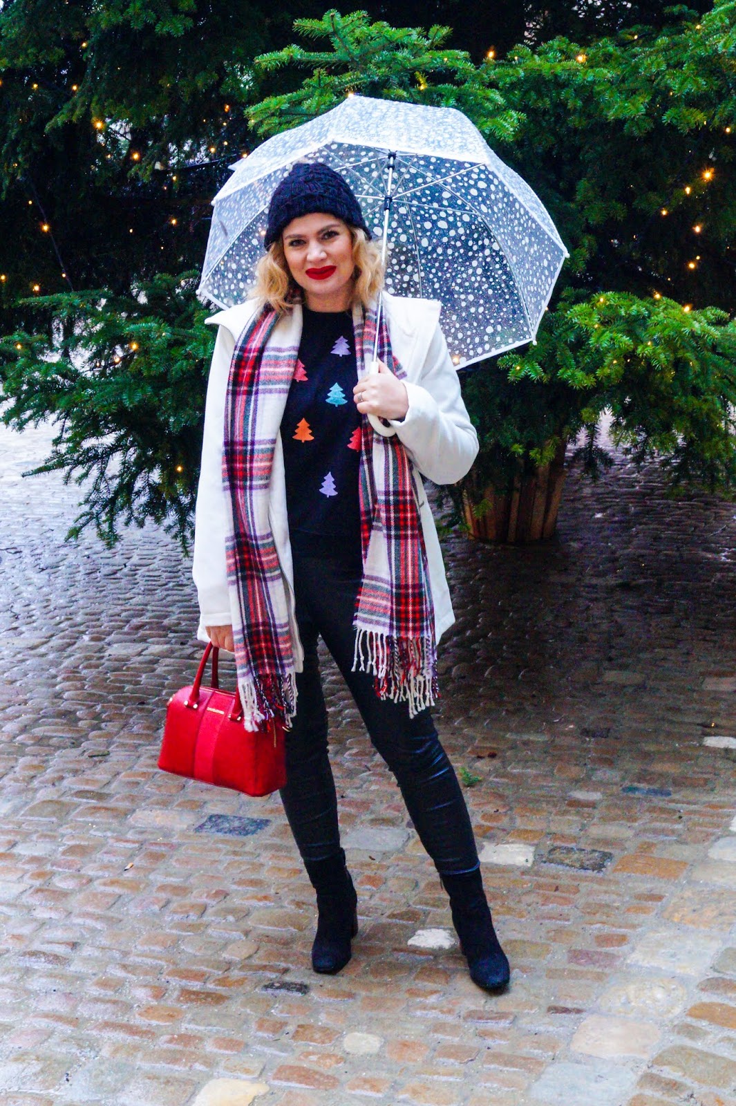 Black Christmas sweater with glitter trees // I have worn this pretty pullover to a few occasions already and I have to admit I love it a lot. The colorful glitter trees make it perfect for so many ways to wear. About two weeks ago I have worn it to our local advent market combined with a plaid scarf, a white wool jacket and a pair of leather leggings.