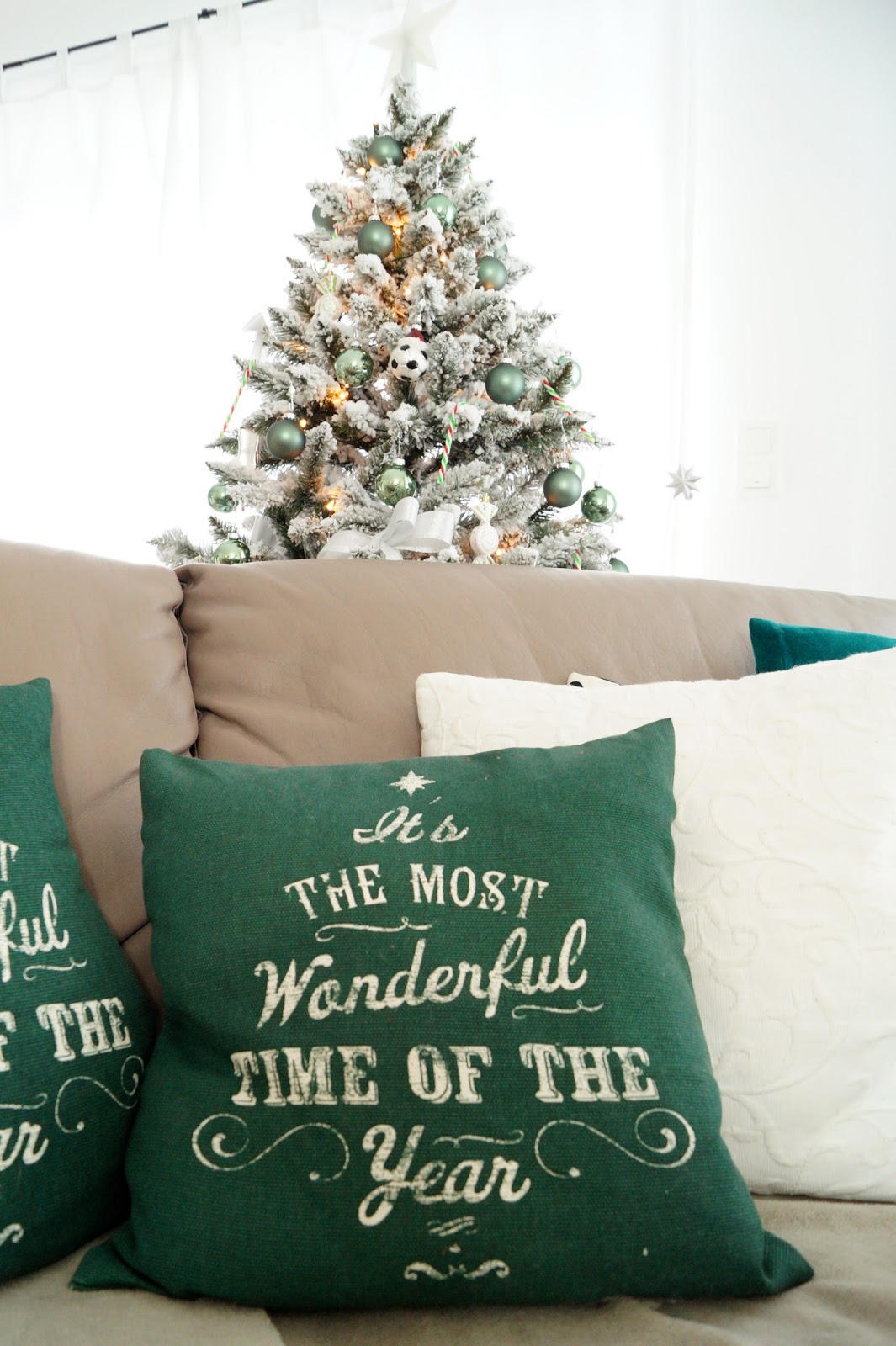 For this years color theme I decided to got with this pretty green color paired with single white and silver ornaments (I had a red tree last year you can view it here).