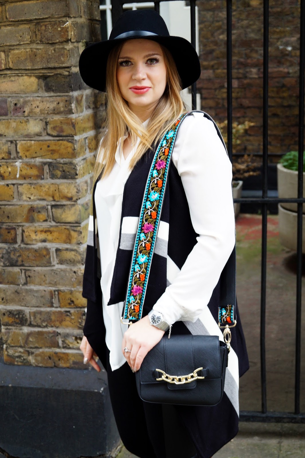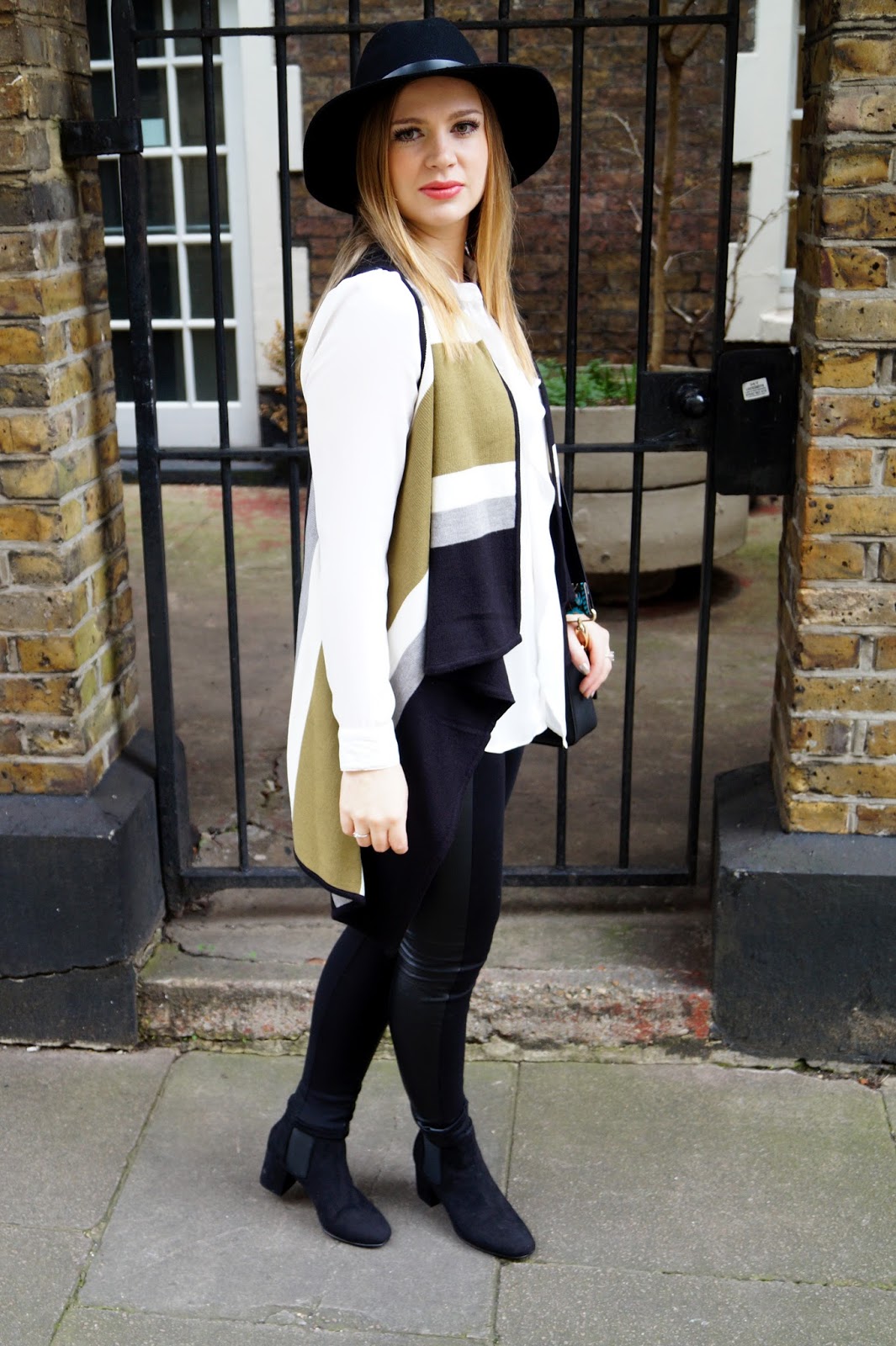 Hat Miss Selfridge / Bag Dorothy Perkins / Blouse similar here / Vest manguun collection / Leggins similar here / Booties H&M