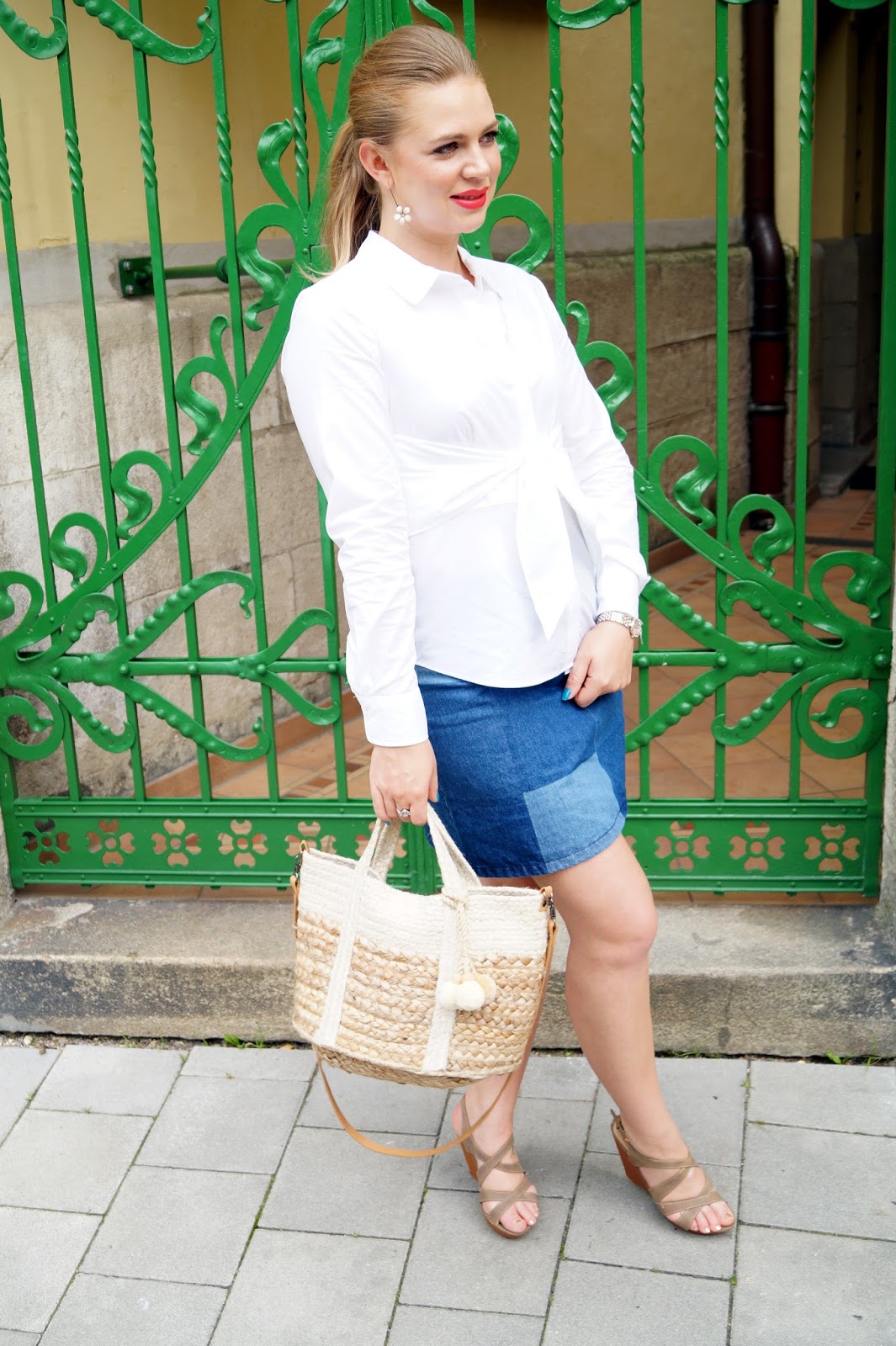 But let´s move on to today´s outfit. Since the 70´s vibe started about one and a half year ago I totally jumped on this train. I love a good pair of flared jeans and hazelnut colored suede boots. Patchwork was also a huge thing back then but I was not sure ´till I found this skirt. It is not a „real“ patchwork skirt means it is not made from several different fabrics all sewed together like the Frankenstein monster. The patchwork is just implied on the denim material but in my opinion that makes it so special. I paired it with a white blouse which was knotted in the front. That my girls is a real highlight for me. I think it is so cool and still classy with a fancy twist. I paired it with my favorite straw bag from Mango and a pair of nude wedges but you can easily transition it to a fall look with a pair of booties and a leather tote.