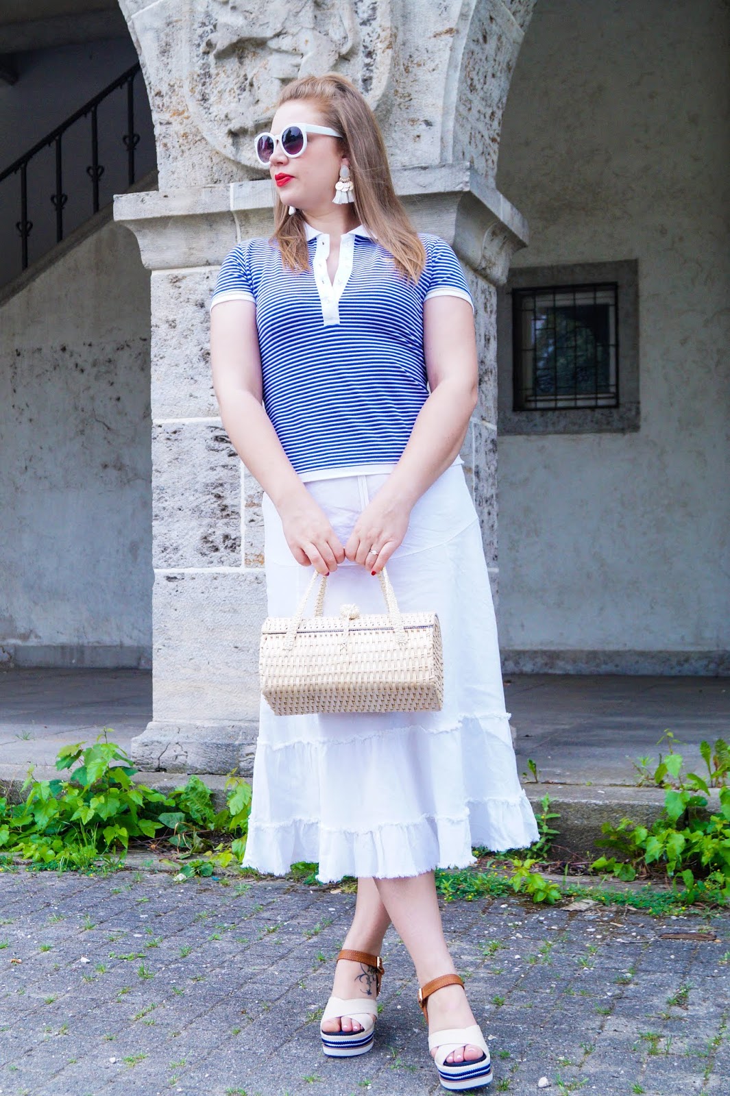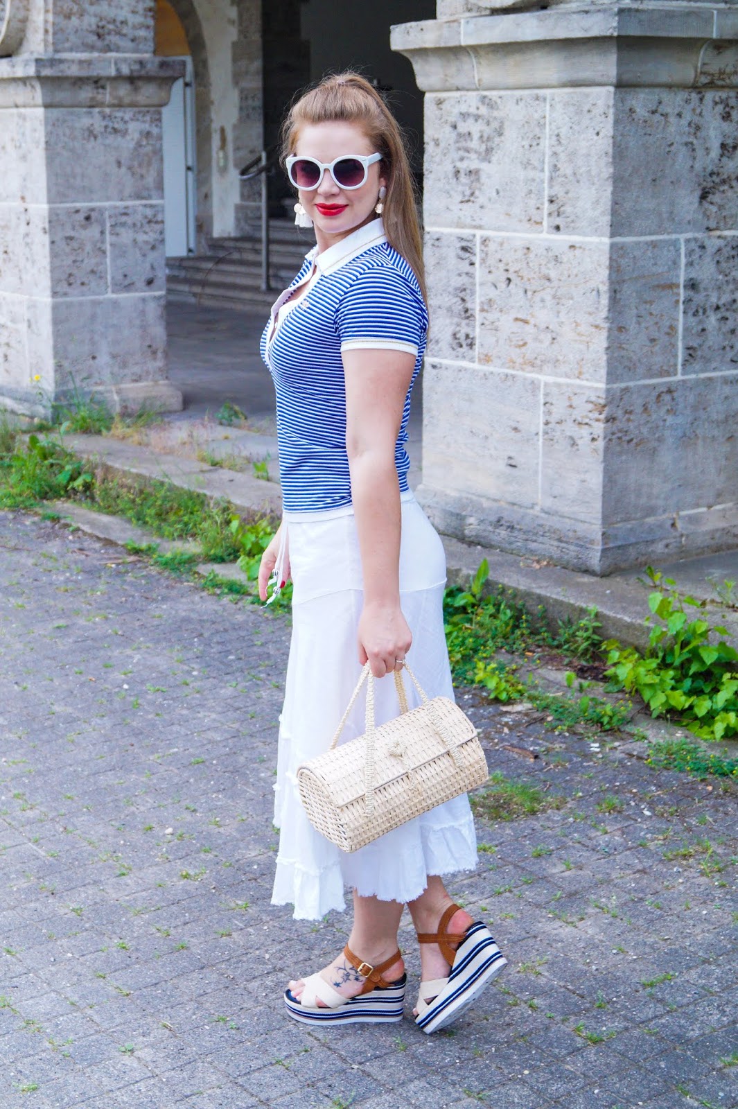 A blue and white tee always adds such a maritime vibe to any look. I have combined it with simple neutral accessoires like the woven basket bag and the wedges and spiced up the look with a vibrant red lip. I recently got this lipstick from MAC and it has been my number one since. Also this will be on constant repeat for Christmas time since it is the perfect red shade.