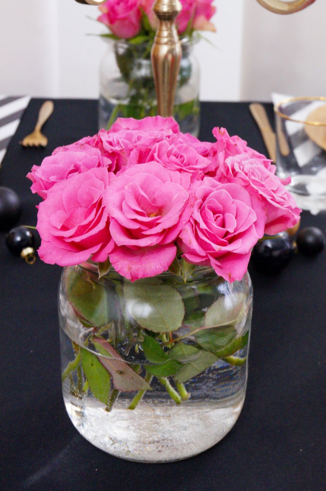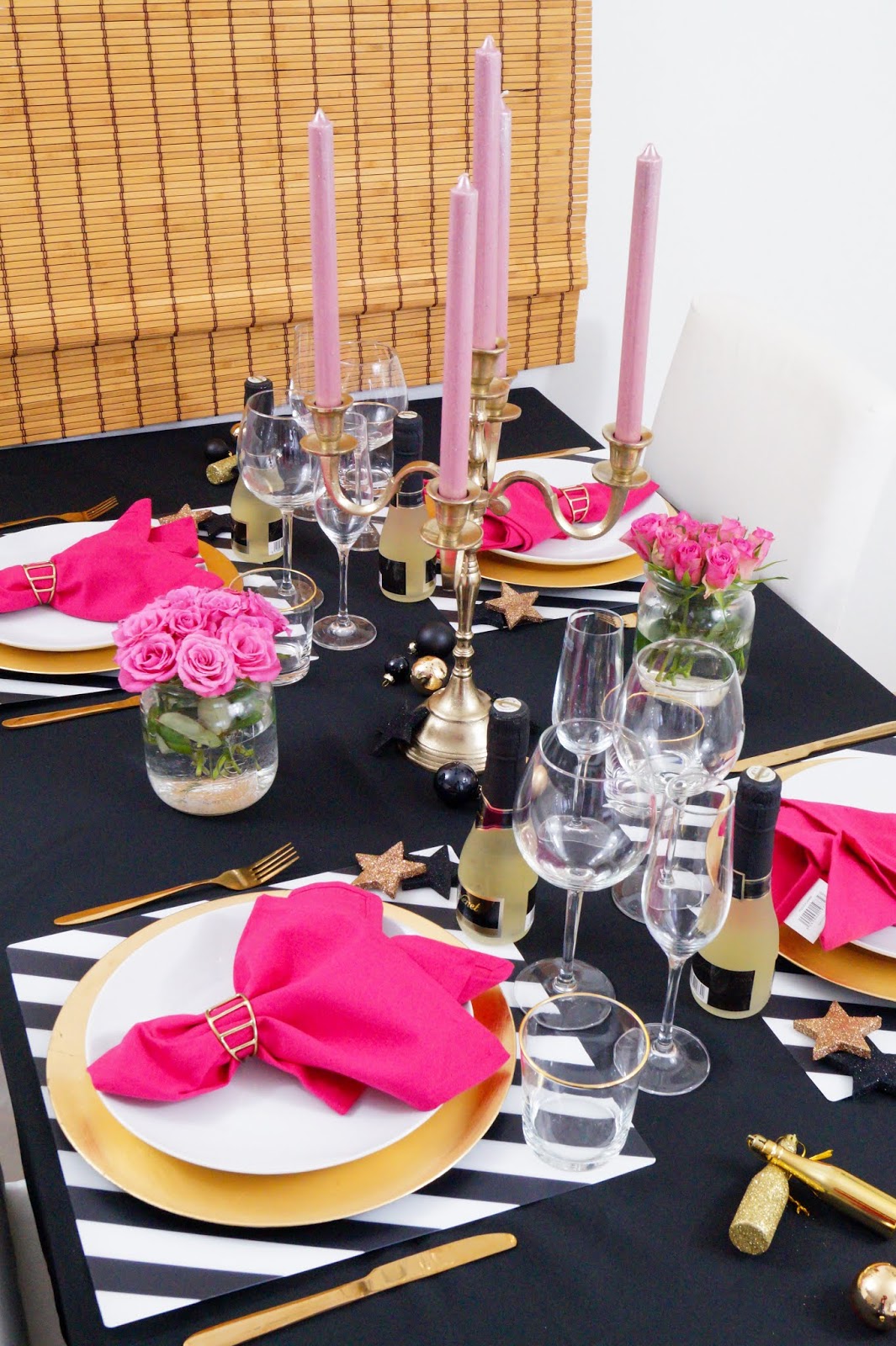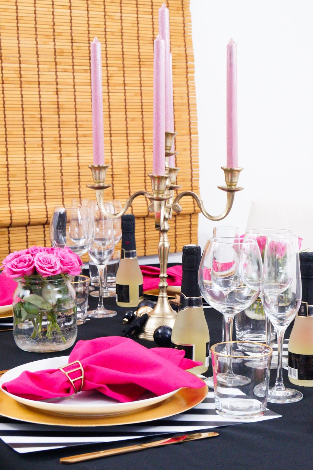 For a festive touch I added these little pink rose arrangements to the table and also the glittery champagne bottle ornaments and brass candlesticks with the rose pink candles.