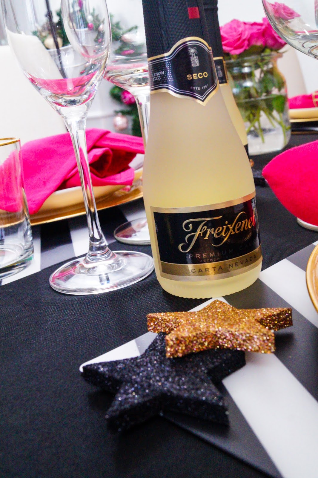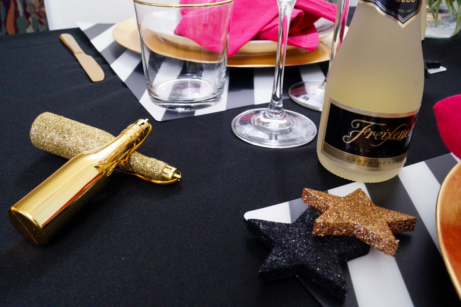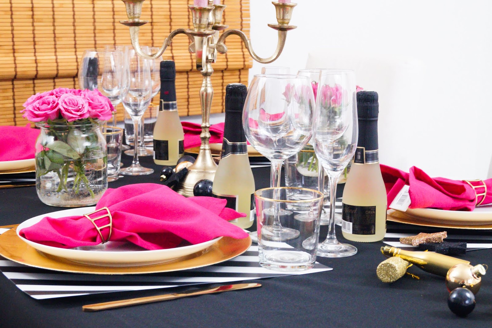 For a festive touch I added these little pink rose arrangements to the table and also the glittery champagne bottle ornaments and brass candlesticks with the rose pink candles.