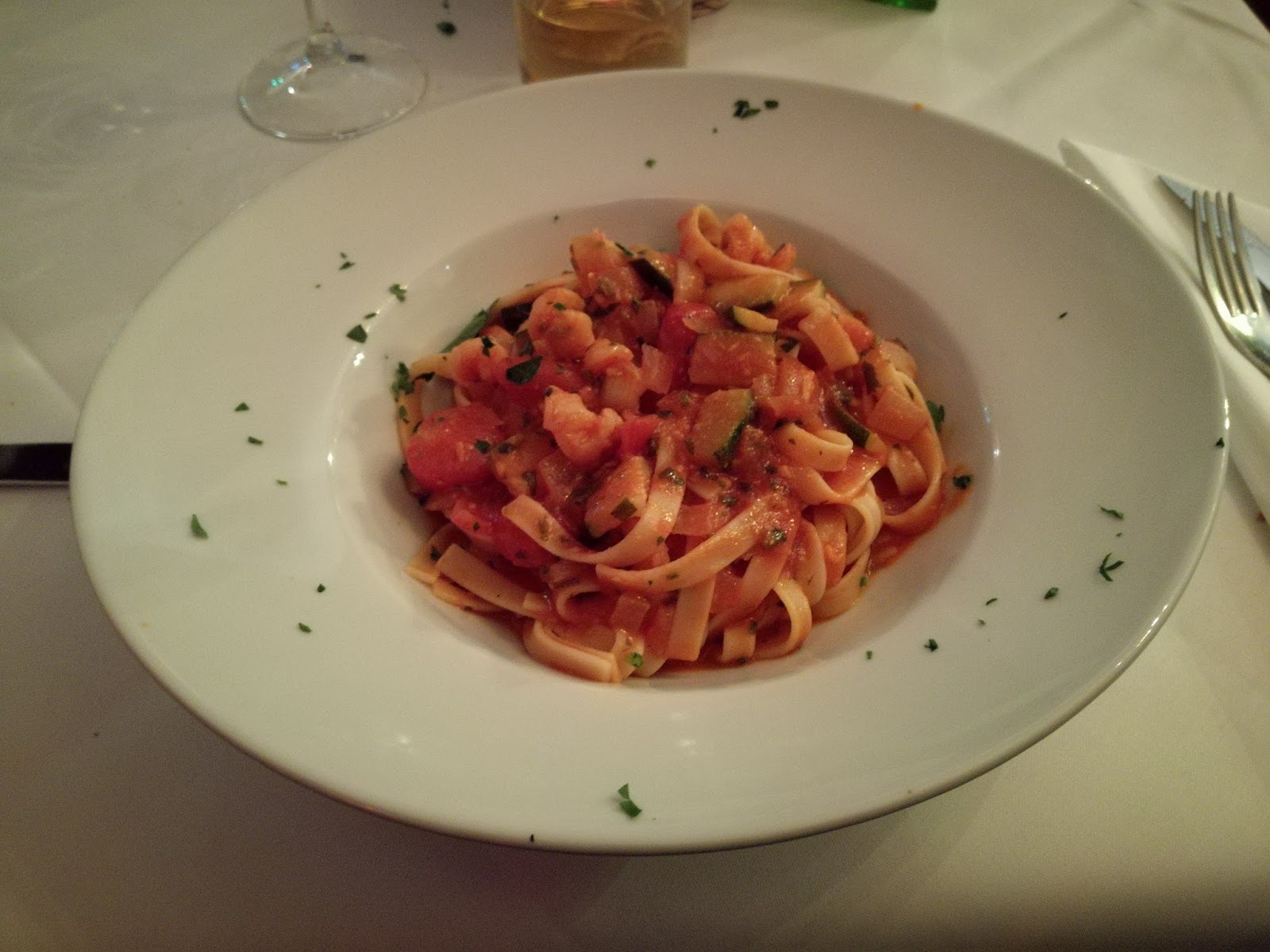 – Fettuccelle mare e monti with zucchini, scampis and tomatoe sauce.